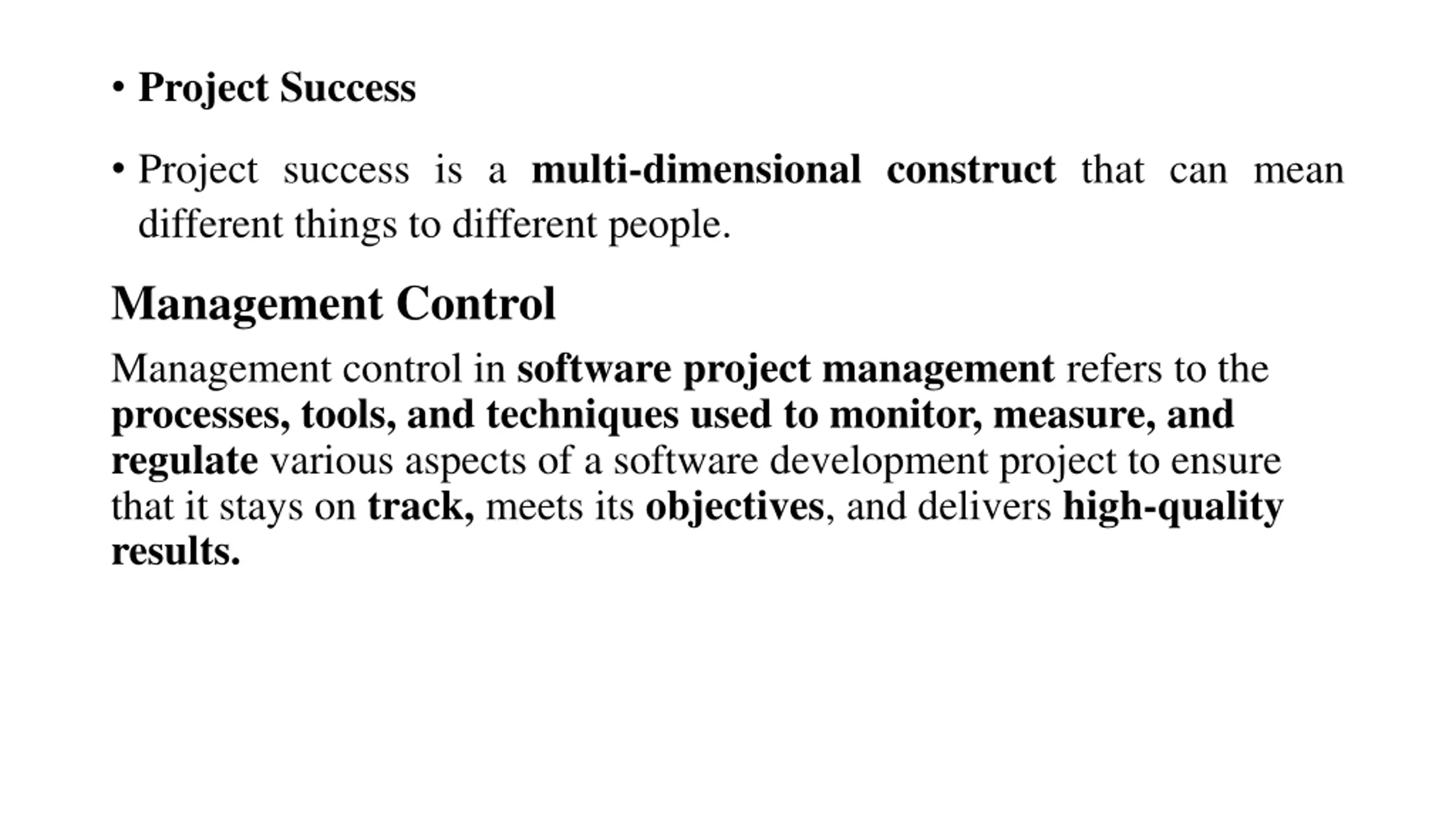 Project Success Project success is a multi-dimensional construct that can mean different things to different people. Management Control Management control in software project management refers to the processes, tools, and techniques used to monitor, measure, and regulate various aspects of a software development project to ensure that it stays on track, meets its objectives, and delivers high-quality results.