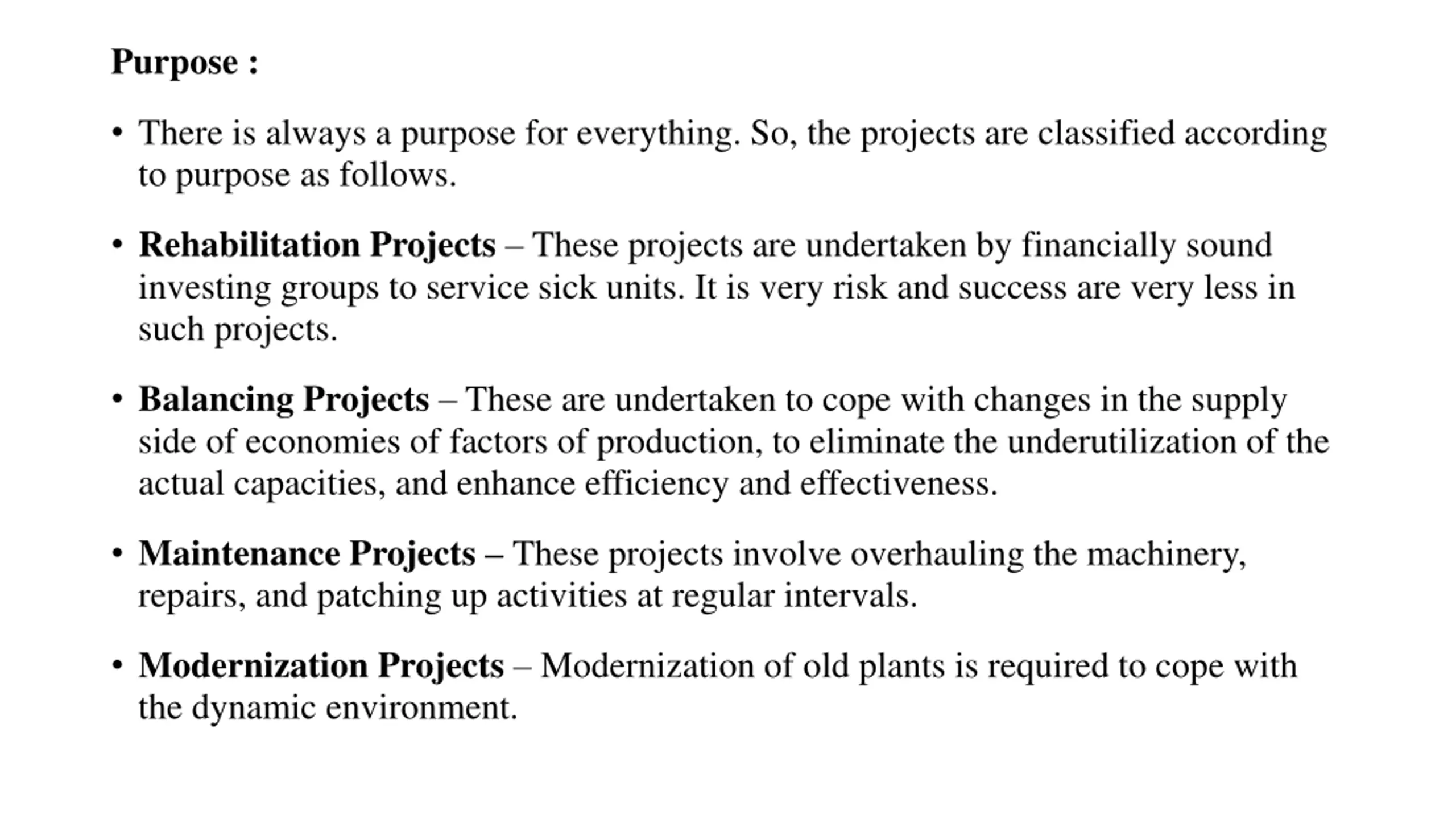 Purpose : There is always a purpose for everything. So, the projects are classified according to purpose as follows. Rehabilitation Projects These projects are undertaken by financially sound investing groups to service sick units. It is very risk and success are very less in such projects. Balancing Projects These are undertaken to cope with changes in the supply side of economies of factors of production, to eliminate the underutilization of the actual capacities, and enhance efficiency and effectiveness. Maintenance Projects These projects involve overhauling the machinery, repairs, and patching up activities at regular intervals. Modernization Projects Modernization of old plants is required to cope with the dynamic environment.