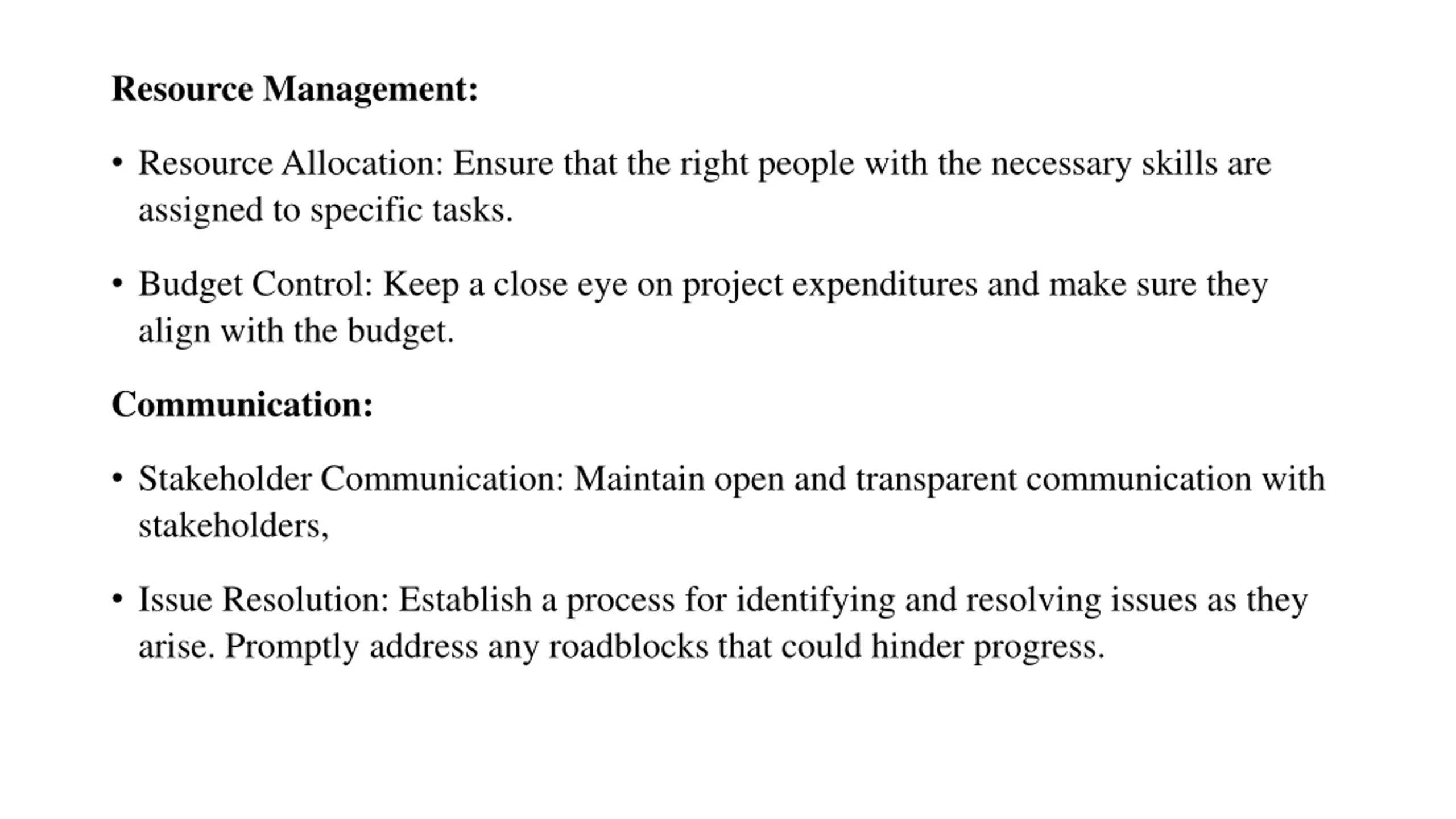 Resource Management: Resource Allocation: Ensure that the right people with the necessary skills are assigned to specific tasks. Budget Control: Keep a close eye on project expenditures and make sure they align with the budget. Communication: Stakeholder Communication: Maintain open and transparent communication with stakeholders, Issue Resolution: Establish a process for identifying and resolving issues as they arise. Promptly address any roadblocks that could hinder progress.