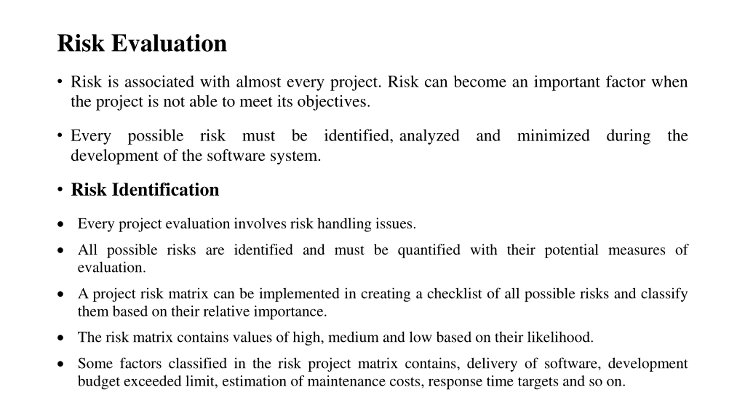 Risk Evaluation Risk is associated with almost every project. Risk can become an important factor when the project is not able to meet its objectives. Every possible risk must be identified, analyzed and minimized during the development of the software system. Risk Identification Every project evaluation involves risk handling issues. All possible risks are identified and must be quantified with their potential measures of evaluation. A project risk matrix can be implemented in creating a checklist of all possible risks and classify them based on their relative importance. The risk matrix contains values of high, medium and low based on their likelihood. Some factors classified in the risk project matrix contains, delivery of software, development budget exceeded limit, estimation of maintenance costs, response time targets and so on.
