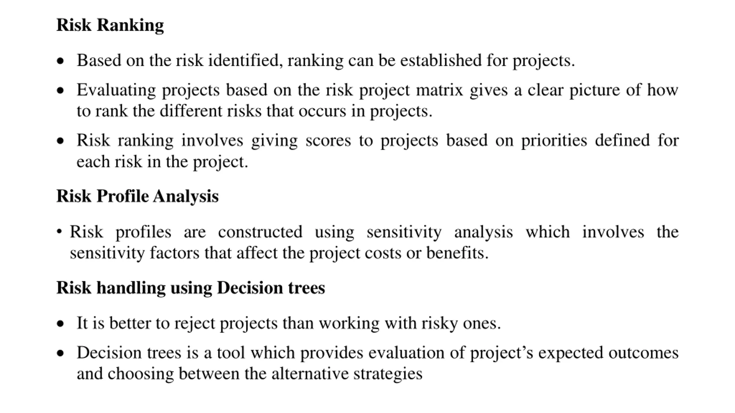 Risk Ranking Based on the risk identified, ranking can be established for projects. Evaluating projects based on the risk project matrix gives a clear picture of how to rank the different risks that occurs in projects. Risk ranking involves giving scores to projects based on priorities defined for each risk in the project. Risk Profile Analysis Risk profiles are constructed using sensitivity analysis which involves the sensitivity factors that affect the project costs or benefits. Risk handling using Decision trees It is better to reject projects than working with risky ones. Decision trees is a tool which provides evaluation of project s expected outcomes and choosing between the alternative strategies