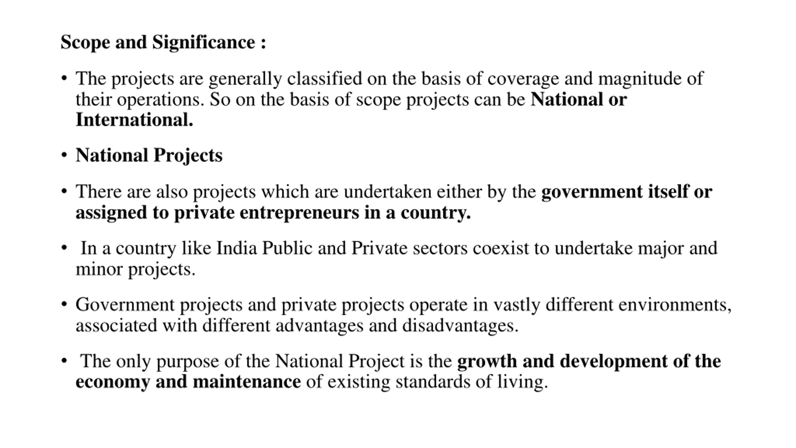 Scope and Significance : The projects are generally classified on the basis of coverage and magnitude of their operations. So on the basis of scope projects can be National or International. National Projects There are also projects which are undertaken either by the government itself or assigned to private entrepreneurs in a country. In a country like India Public and Private sectors coexist to undertake major and minor projects. Government projects and private projects operate in vastly different environments, associated with different advantages and disadvantages. The only purpose of the National Project is the growth and development of the economy and maintenance of existing standards of living.