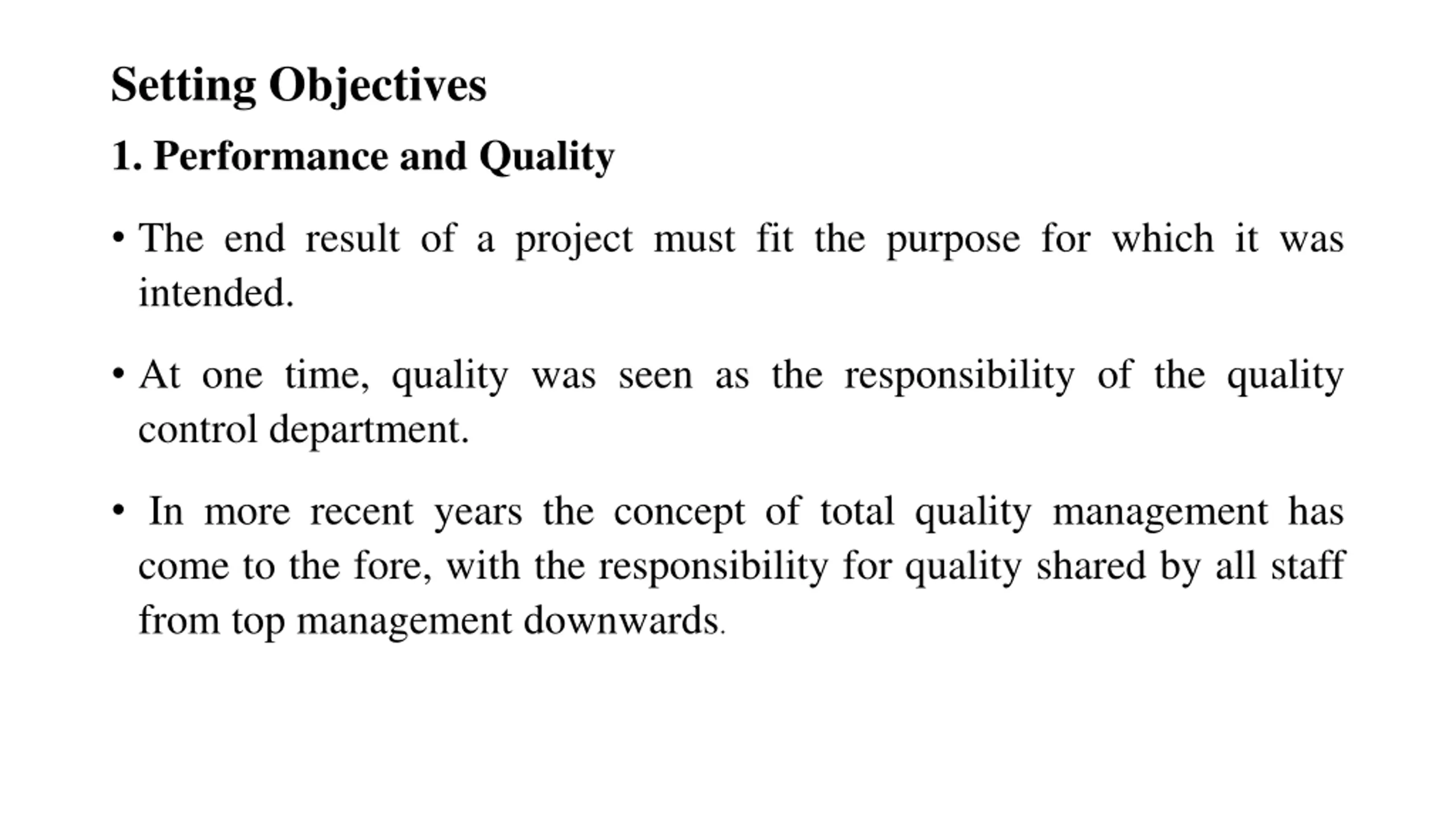 Setting Objectives 1. Performance and Quality The end result of a project must fit the purpose for which it was intended. At one time, quality was seen as the responsibility of the quality control department. In more recent years the concept of total quality management has come to the fore, with the responsibility for quality shared by all staff from top management downwards.