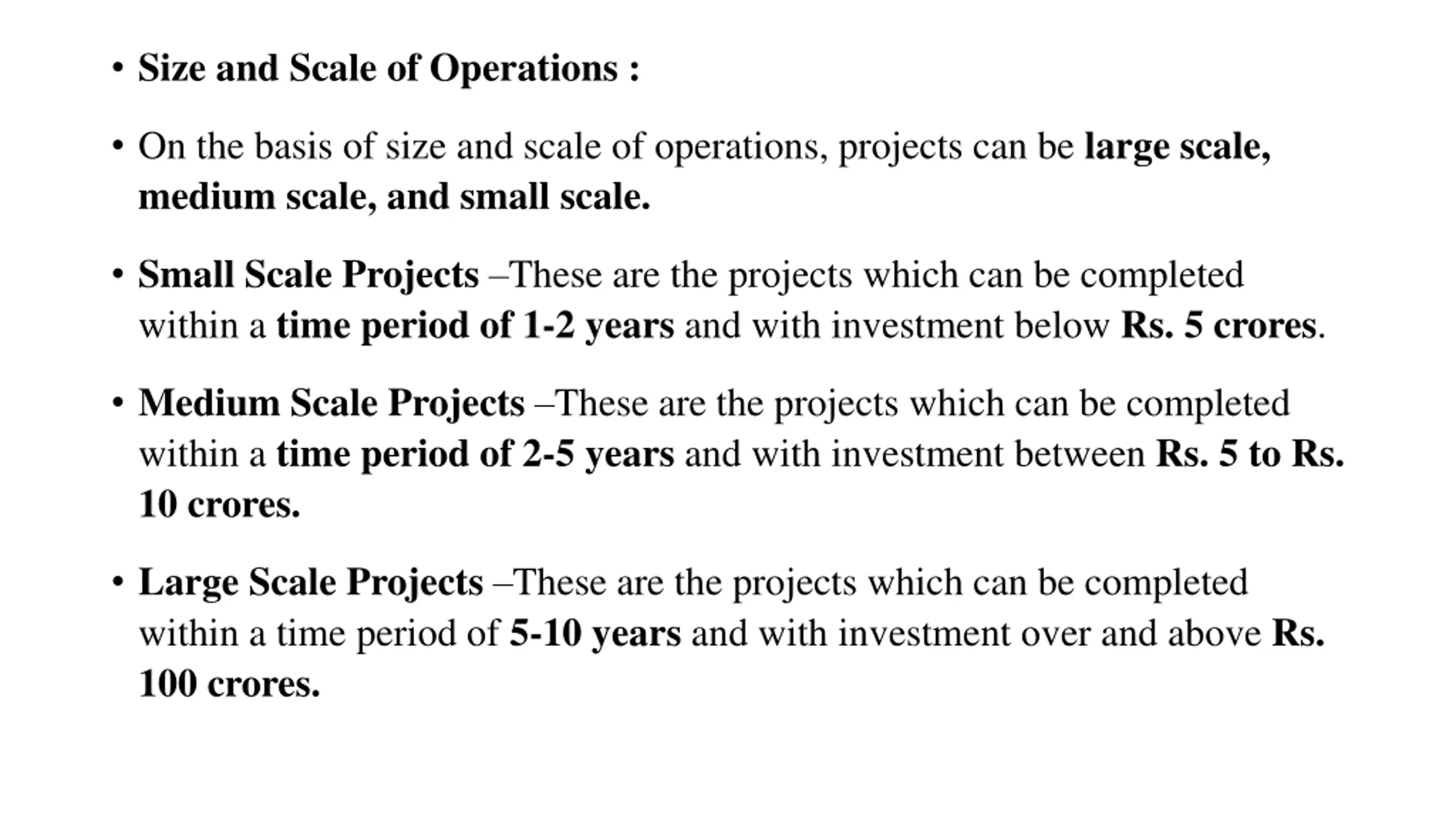 Size and Scale of Operations : On the basis of size and scale of operations, projects can be large scale, medium scale, and small scale. Small Scale Projects These are the projects which can be completed within a time period of 1-2 years and with investment below Rs. 5 crores. Medium Scale Projects These are the projects which can be completed within a time period of 2-5 years and with investment between Rs. 5 to Rs. 10 crores. Large Scale Projects These are the projects which can be completed within a time period of 5-10 years and with investment over and above Rs. 100 crores.