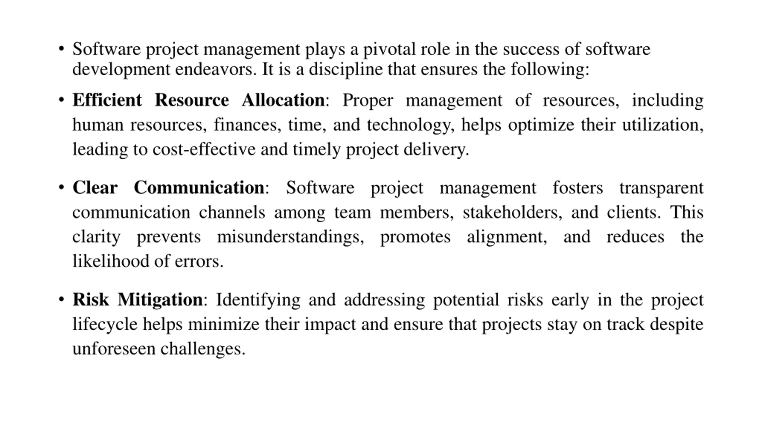 Software project management plays a pivotal role in the success of software development endeavors. It is a discipline that ensures the following: Efficient Resource Allocation: Proper management of resources, including human resources, finances, time, and technology, helps optimize their utilization, leading to cost-effective and timely project delivery. Clear Communication: Software project management fosters transparent communication channels among team members, stakeholders, and clients. This clarity prevents misunderstandings, promotes alignment, and reduces the likelihood of errors. Risk Mitigation: Identifying and addressing potential risks early in the project lifecycle helps minimize their impact and ensure that projects stay on track despite unforeseen challenges.