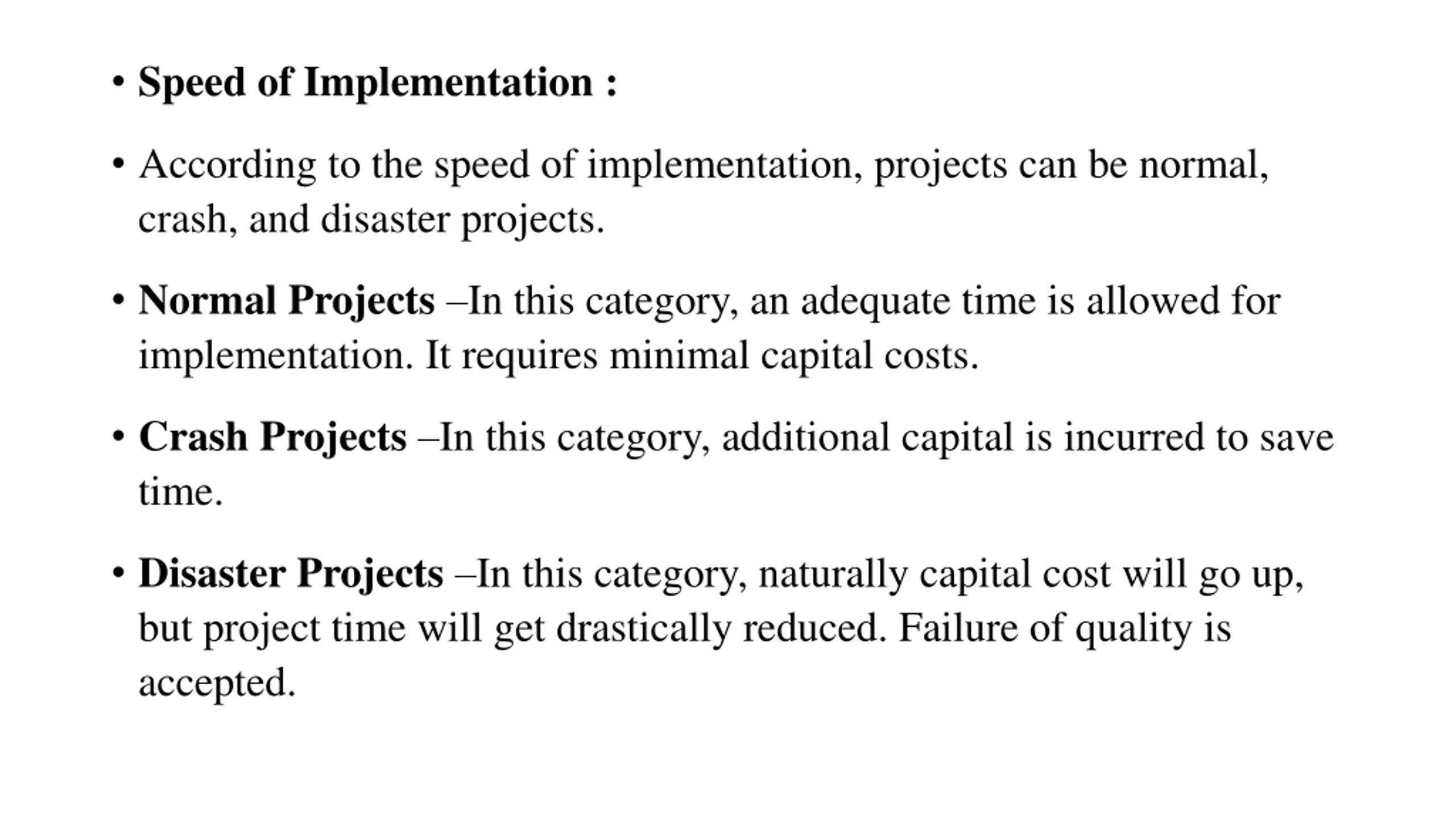 Speed of Implementation : According to the speed of implementation, projects can be normal, crash, and disaster projects. Normal Projects In this category, an adequate time is allowed for implementation. It requires minimal capital costs. Crash Projects In this category, additional capital is incurred to save time. Disaster Projects In this category, naturally capital cost will go up, but project time will get drastically reduced. Failure of quality is accepted.