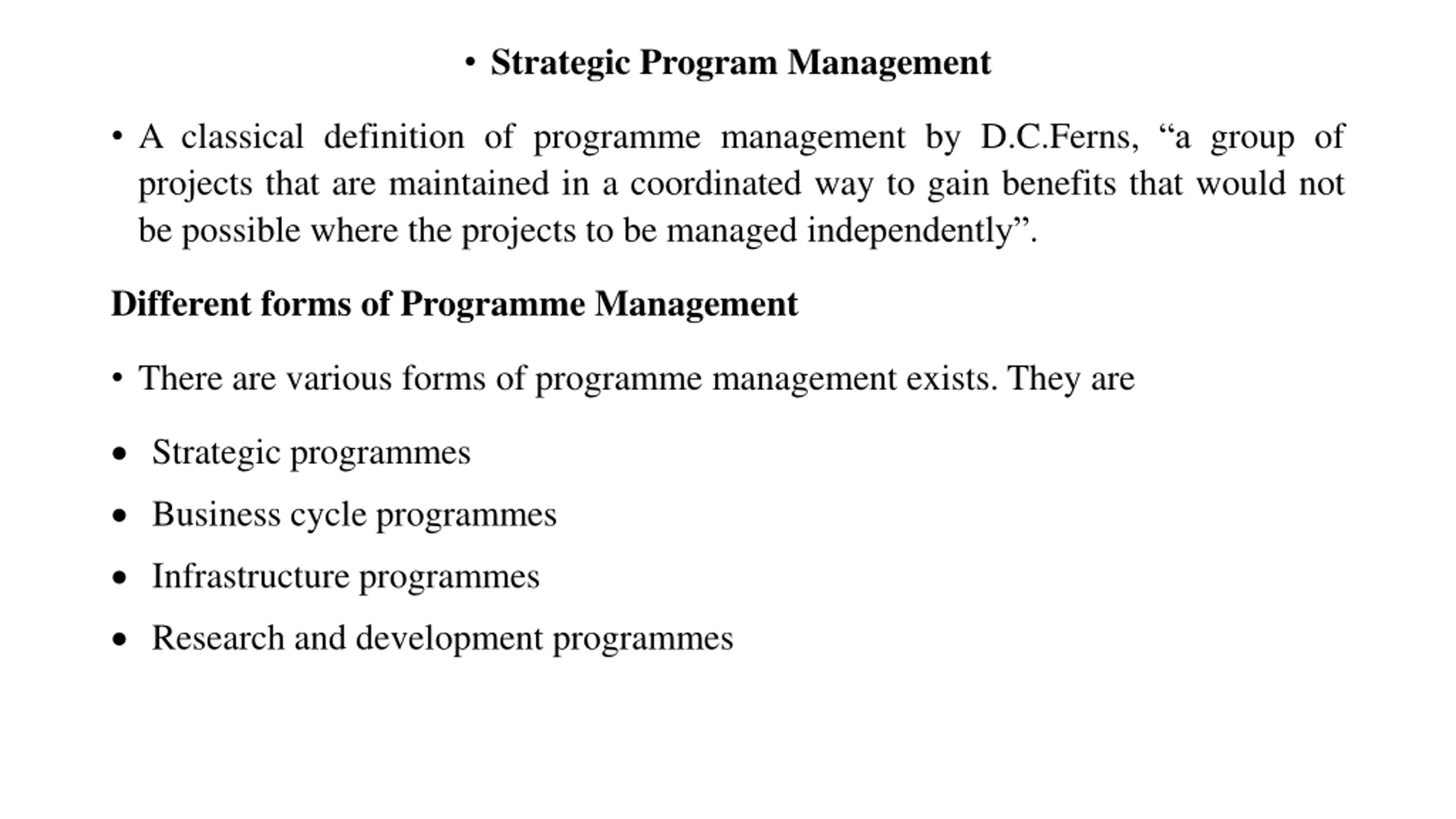 Strategic Program Management A classical definition of programme management by D.C.Ferns, a group of projects that are maintained in a coordinated way to gain benefits that would not be possible where the projects to be managed independently . Different forms of Programme Management There are various forms of programme management exists. They are Strategic programmes Business cycle programmes Infrastructure programmes Research and development programmes