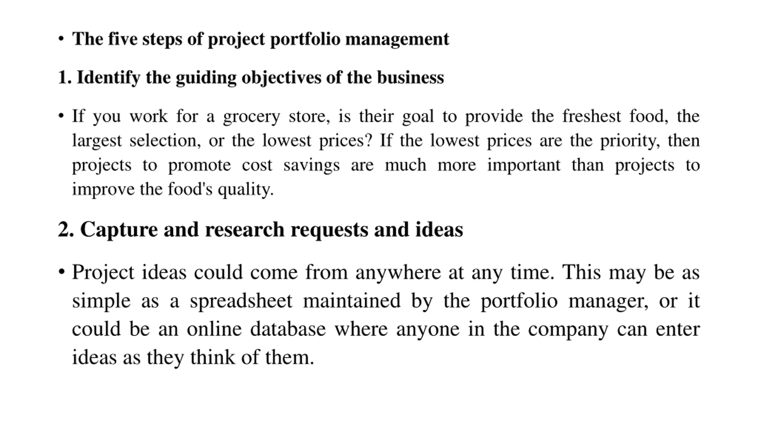 The five steps of project portfolio management 1. Identify the guiding objectives of the business If you work for a grocery store, is their goal to provide the freshest food, the largest selection, or the lowest prices? If the lowest prices are the priority, then projects to promote cost savings are much more important than projects to improve the food's quality. 2. Capture and research requests and ideas Project ideas could come from anywhere at any time. This may be as simple as a spreadsheet maintained by the portfolio manager, or it could be an online database where anyone in the company can enter ideas as they think of them.