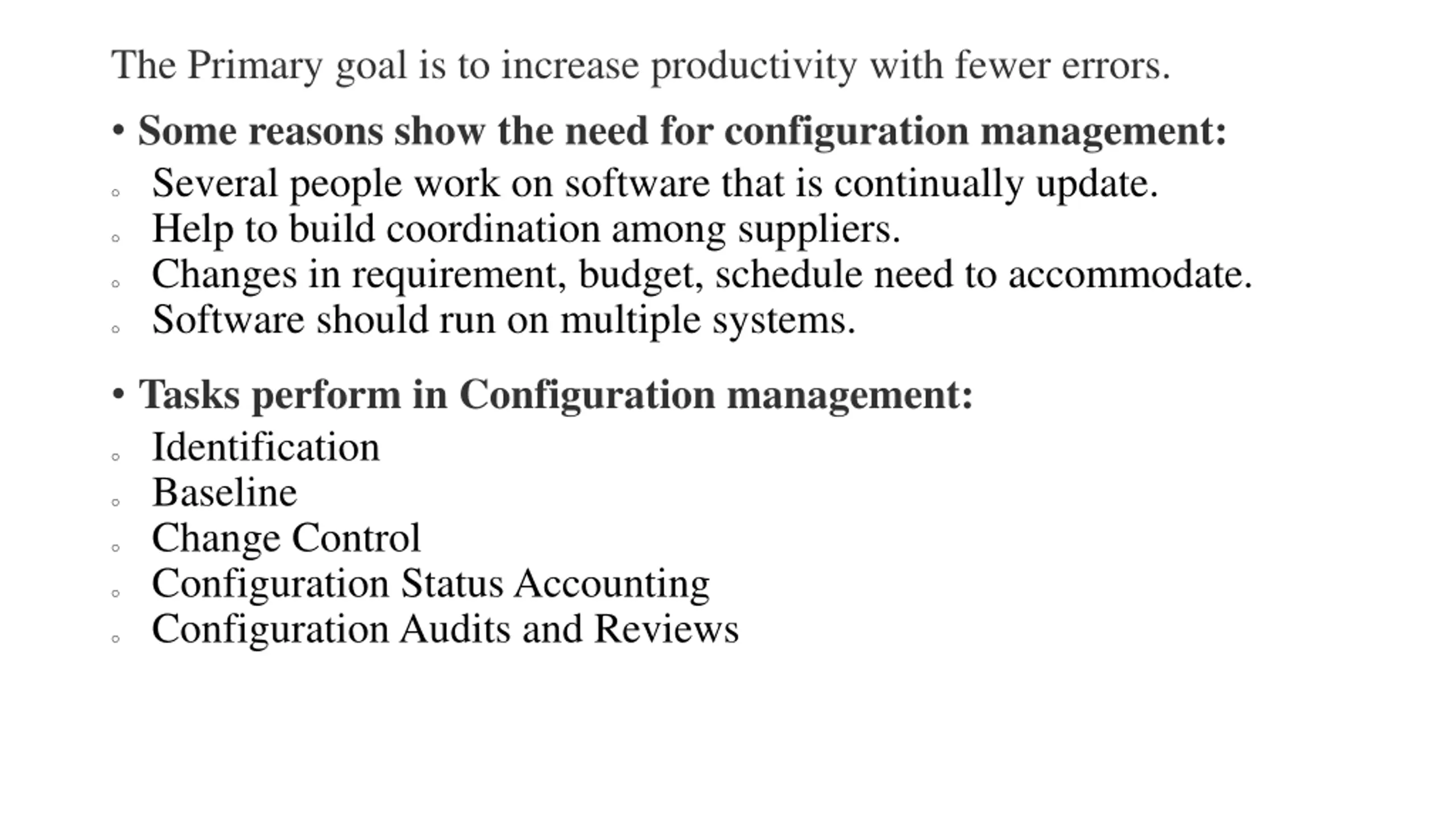 The Primary goal is to increase productivity with fewer errors. Some reasons show the need for configuration management: o Several people work on software that is continually update. o Help to build coordination among suppliers. o Changes in requirement, budget, schedule need to accommodate. o Software should run on multiple systems. Tasks perform in Configuration management: o Identification o Baseline o Change Control o Configuration StatusAccounting o ConfigurationAudits and Reviews