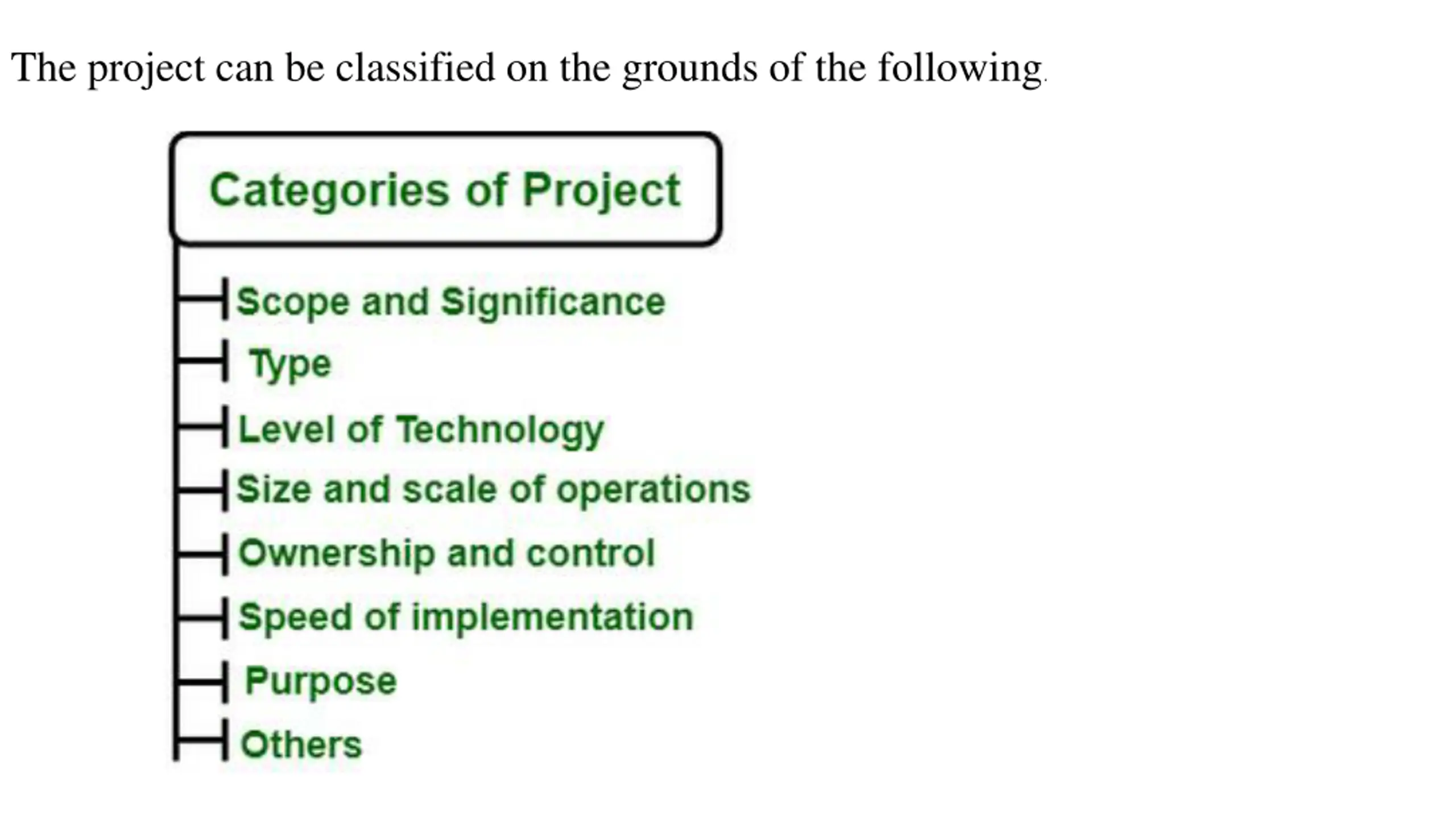 Categorization of Software Projects In project management, there are many categories that need to plan as well while planning the project. You will see each category in detail that how we can define the categories of the project. You will see categories like scope and significance, type of the project, level of technology, size, and scale of operations, ownership, and control, implementations, and purpose of the project are generally used categories. If you re planning a project and want to implement, then you can consider these categories. Projects are often categorized on the basis of their scope, size, speed of implementation, location, type, and technology.
