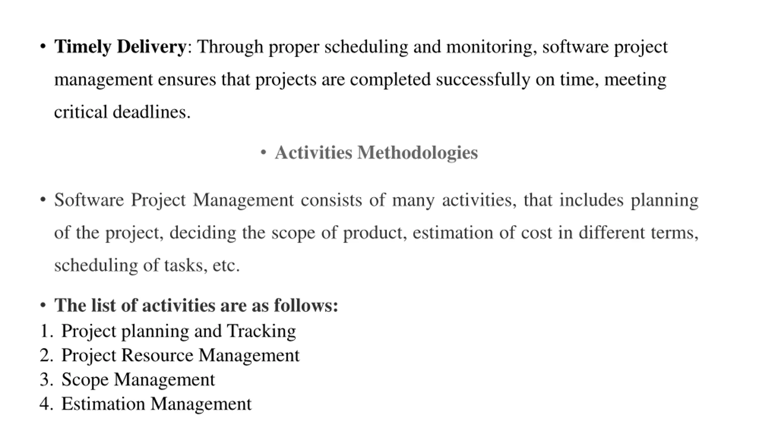 Timely Delivery: Through proper scheduling and monitoring, software project management ensures that projects are completed successfully on time, meeting critical deadlines. Activities Methodologies Software Project Management consists of many activities, that includes planning of the project, deciding the scope of product, estimation of cost in different terms, scheduling of tasks, etc. The list of activities are as follows: 1. Project planning and Tracking 2. Project Resource Management 3. Scope Management 4. Estimation Management