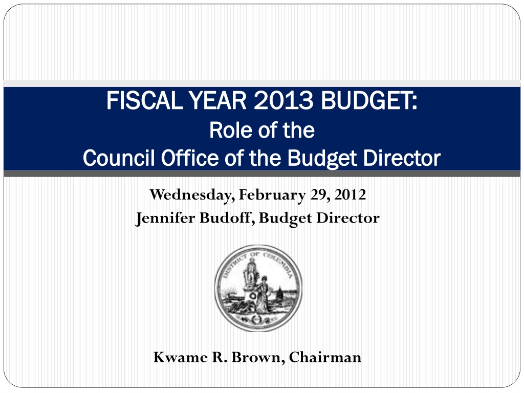 FISCAL YEAR 2013 BUDGET: FISCAL YEAR 2013 BUDGET: Role of the Role of the Council Office of the Budget Director Council Office of the Budget Director Wednesday, February 29, 2012 Jennifer Budoff, Budget Director http://dccouncil.us/images/logos/largeseal.png Kwame R. Brown, Chairman