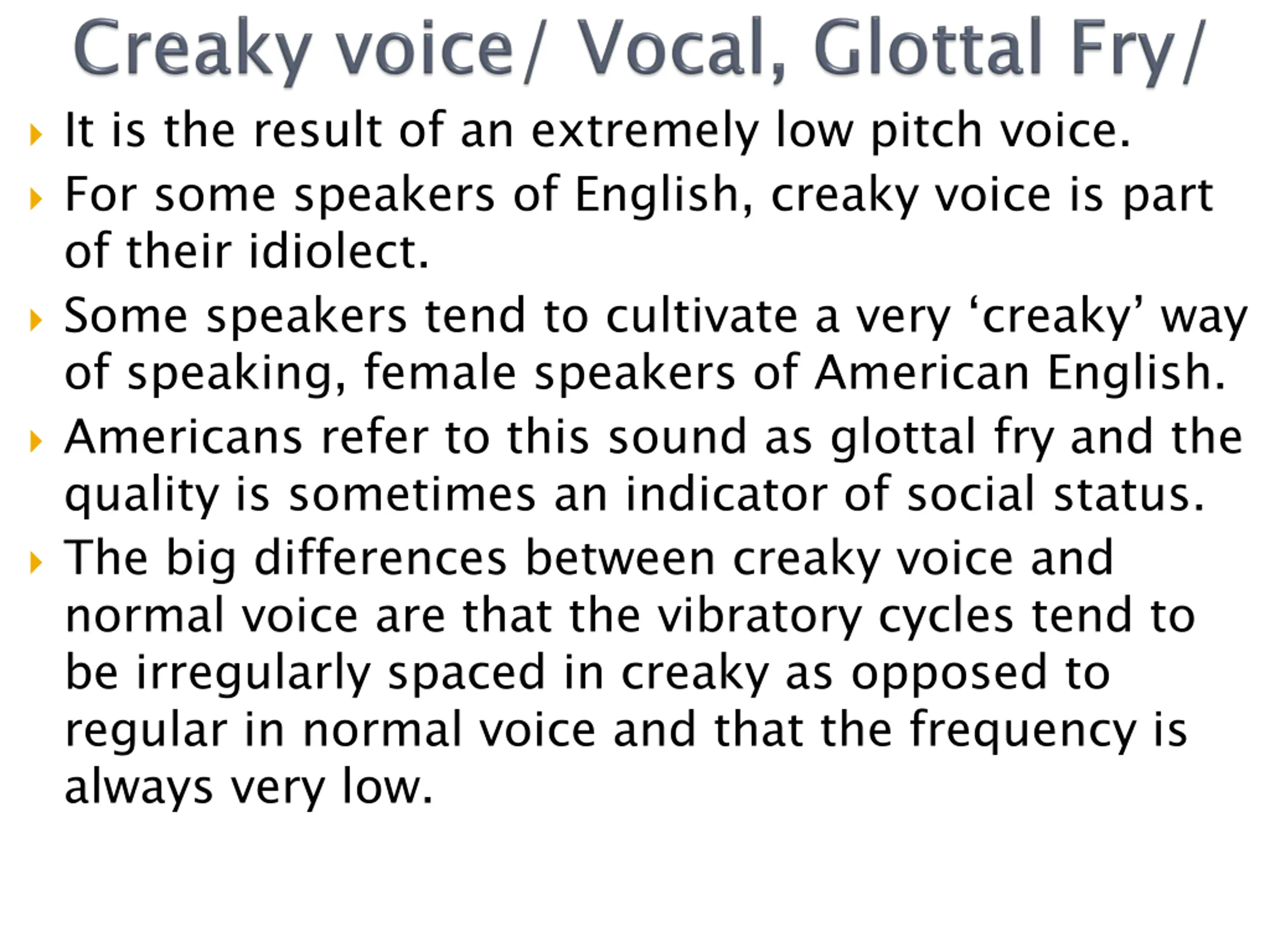 It is the result of an extremely low pitch voice. For some speakers of English, creaky voice is part of their idiolect. Some speakers tend to cultivate a very creaky way of speaking, female speakers of American English. Americans refer to this sound as glottal fry and the quality is sometimes an indicator of social status. The big differences between creaky voice and normal voice are that the vibratory cycles tend to be irregularly spaced in creaky as opposed to regular in normal voice and that the frequency is always very low.