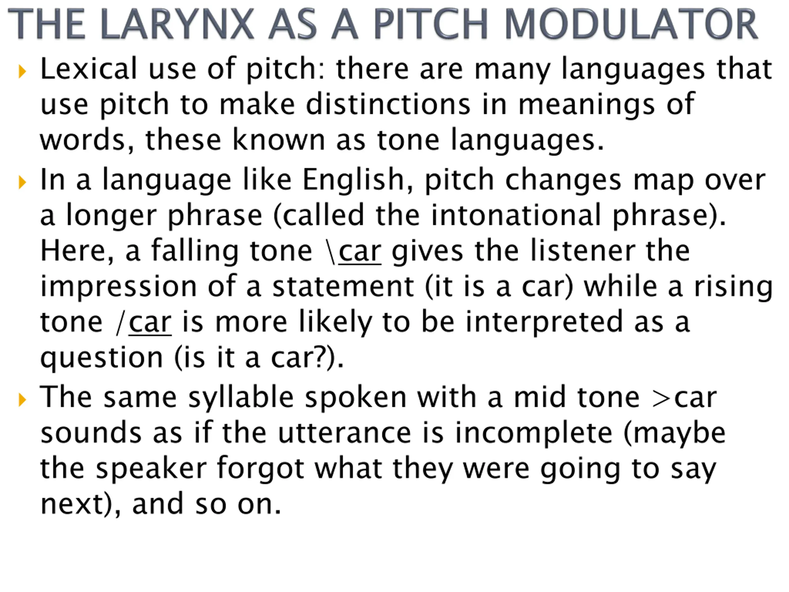 Lexical use of pitch: there are many languages that use pitch to make distinctions in meanings of words, these known as tone languages. In a language like English, pitch changes map over a longer phrase (called the intonational phrase). Here, a falling tone \car gives the listener the impression of a statement (it is a car) while a rising tone /car is more likely to be interpreted as a question (is it a car?). The same syllable spoken with a mid tone >car sounds as if the utterance is incomplete (maybe the speaker forgot what they were going to say next), and so on.