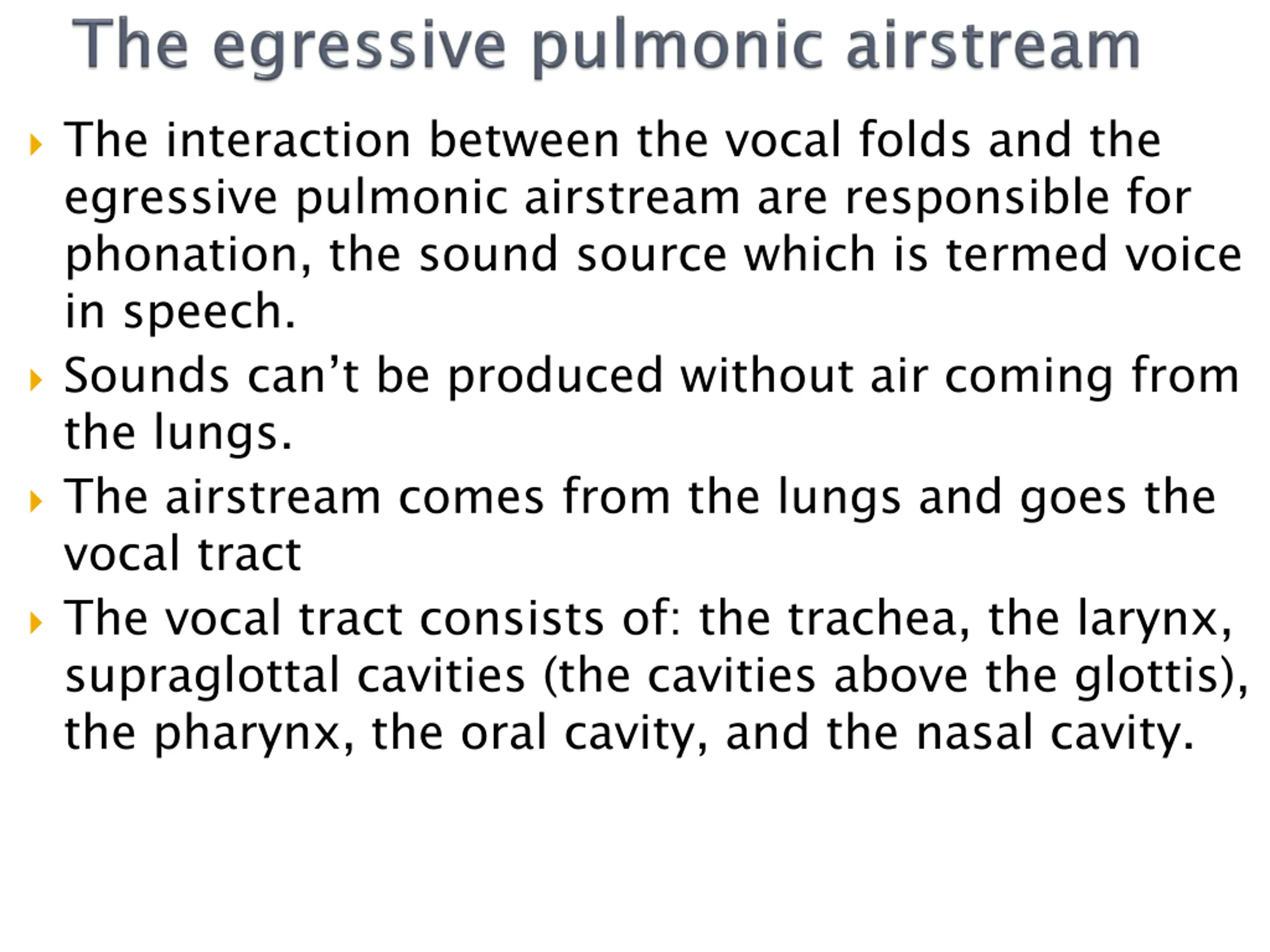 The interaction between the vocal folds and the egressive pulmonic airstream are responsible for phonation, the sound source which is termed voice in speech. Sounds can t be produced without air coming from the lungs. The airstream comes from the lungs and goes the vocal tract The vocal tract consists of: the trachea, the larynx, supraglottal cavities (the cavities above the glottis), the pharynx, the oral cavity, and the nasal cavity.