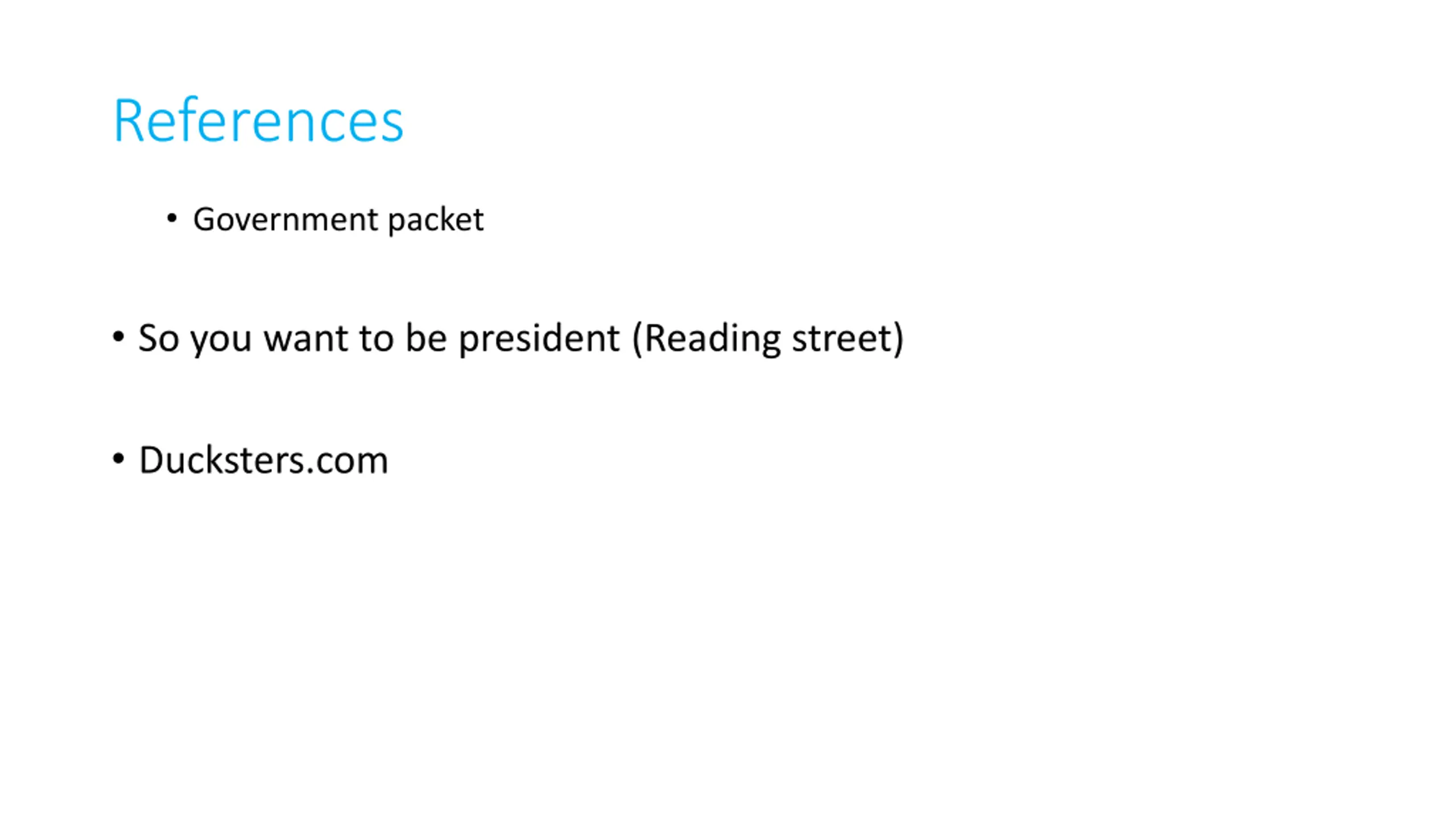 References Government packet So you want to be president (Reading street) Ducksters.com