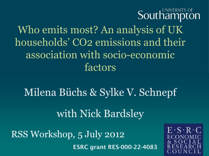Who emits most? An analysis of UK households CO2 emissions and their association with socio-economic factors Milena B chs & Sylke V. Schnepf with Nick Bardsley RSS Workshop, 5 July 2012 ESRC grant RES-000-22-4083