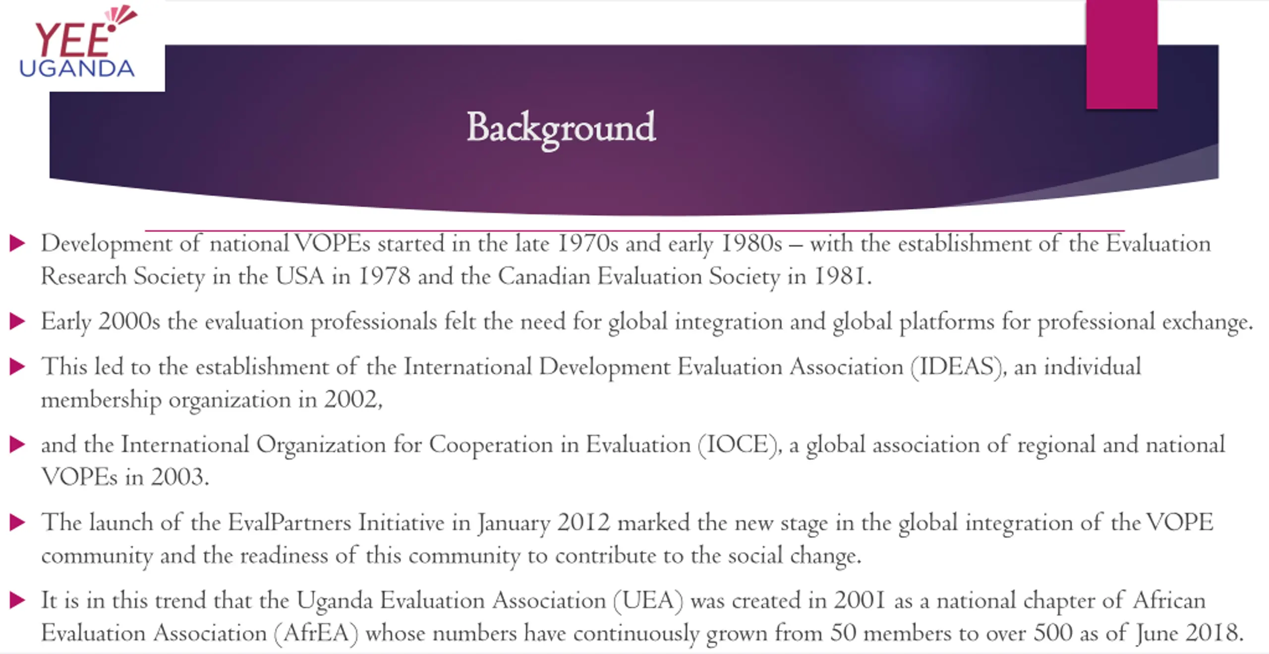 Background Background Development of national VOPEs started in the late 1970s and early 1980s with the establishment of the Evaluation Research Society in the USA in 1978 and the Canadian Evaluation Society in 1981. Early 2000s the evaluation professionals felt the need for global integration and global platforms for professional exchange. This led to the establishment of the International Development Evaluation Association (IDEAS), an individual membership organization in 2002, and the International Organization for Cooperation in Evaluation (IOCE), a global association of regional and national VOPEs in 2003. The launch of the EvalPartners Initiative in January 2012 marked the new stage in the global integration of the VOPE community and the readiness of this community to contribute to the social change. It is in this trend that the Uganda Evaluation Association (UEA) was created in 2001 as a national chapter of African Evaluation Association (AfrEA) whose numbers have continuously grown from 50 members to over 500 as of June 2018.