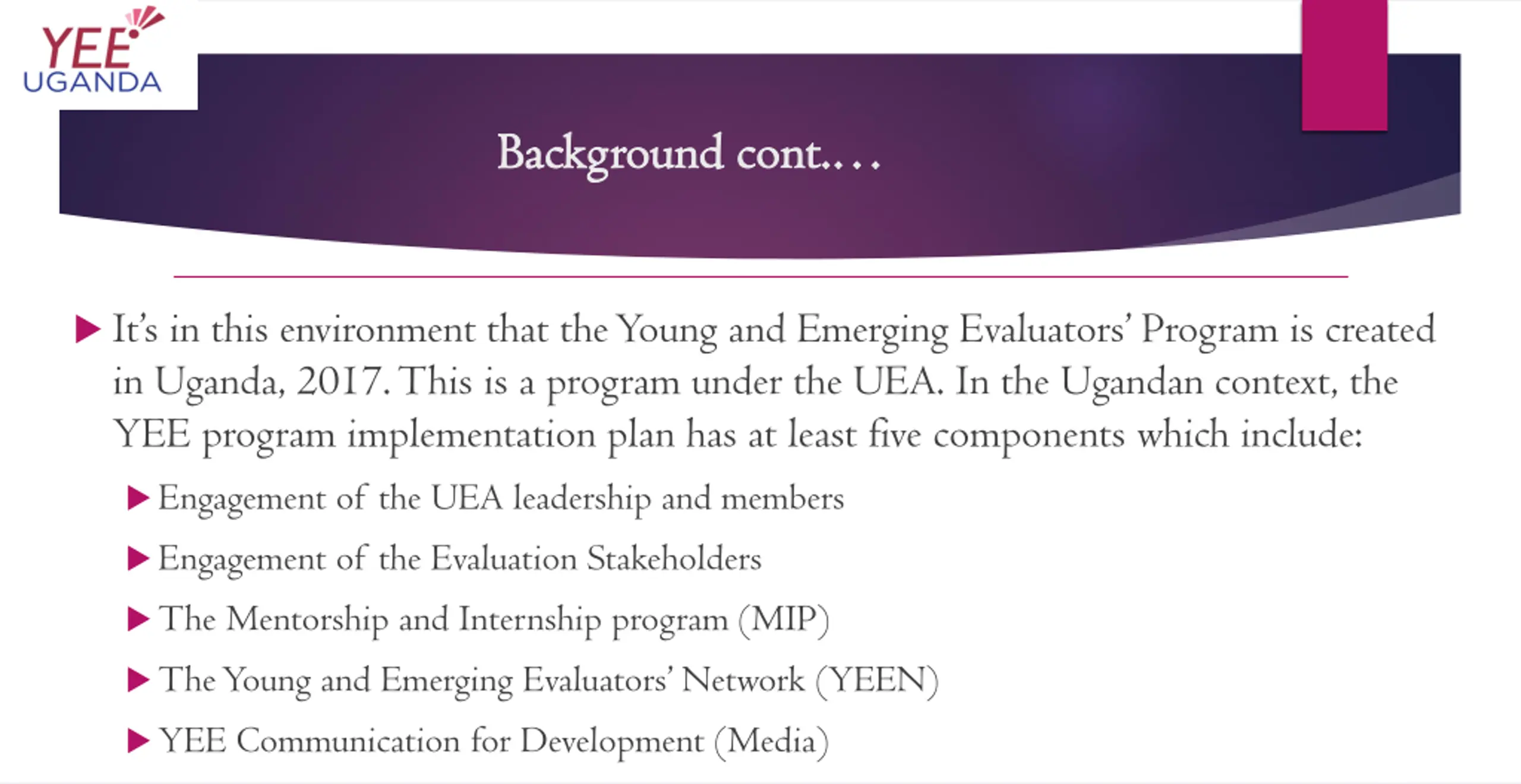 Background cont. Background cont. It s in this environment that the Young and Emerging Evaluators Program is created in Uganda, 2017. This is a program under the UEA. In the Ugandan context, the YEE program implementation plan has at least five components which include: Engagement of the UEA leadership and members Engagement of the Evaluation Stakeholders The Mentorship and Internship program (MIP) The Young and Emerging Evaluators Network (YEEN) YEE Communication for Development (Media)