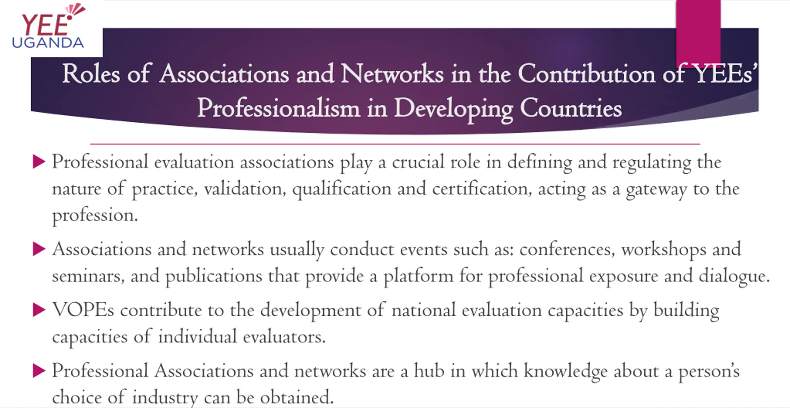 Roles of Associations and Networks in the Contribution of YEEs Roles of Associations and Networks in the Contribution of YEEs Professionalism in Developing Countries Professionalism in Developing Countries Professional evaluation associations play a crucial role in defining and regulating the nature of practice, validation, qualification and certification, acting as a gateway to the profession. Associations and networks usually conduct events such as: conferences, workshops and seminars, and publications that provide a platform for professional exposure and dialogue. VOPEs contribute to the development of national evaluation capacities by building capacities of individual evaluators. Professional Associations and networks are a hub in which knowledge about a person s choice of industry can be obtained.
