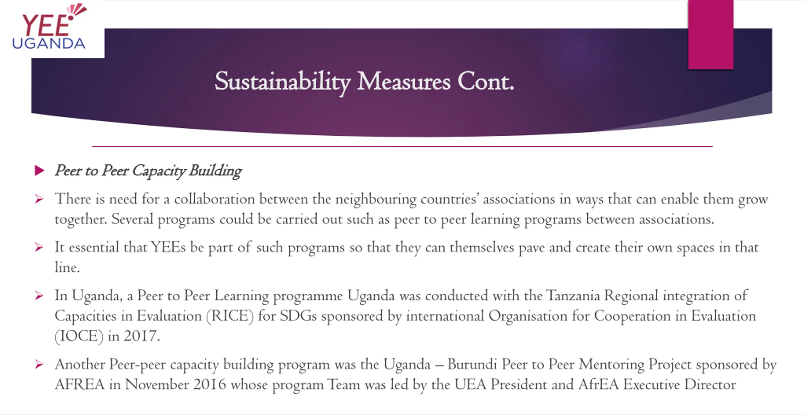 Sustainability Measures Cont. Sustainability Measures Cont. Peer to Peer Capacity Building Peer to Peer Capacity Building There is need for a collaboration between the neighbouring countries associations in ways that can enable them grow together. Several programs could be carried out such as peer to peer learning programs between associations. It essential that YEEs be part of such programs so that they can themselves pave and create their own spaces in that line. In Uganda, a Peer to Peer Learning programme Uganda was conducted with the Tanzania Regional integration of Capacities in Evaluation (RICE) for SDGs sponsored by international Organisation for Cooperation in Evaluation (IOCE) in 2017. Another Peer-peer capacity building program was the Uganda Burundi Peer to Peer Mentoring Project sponsored by AFREA in November 2016 whose program Team was led by the UEA President and AfrEA Executive Director