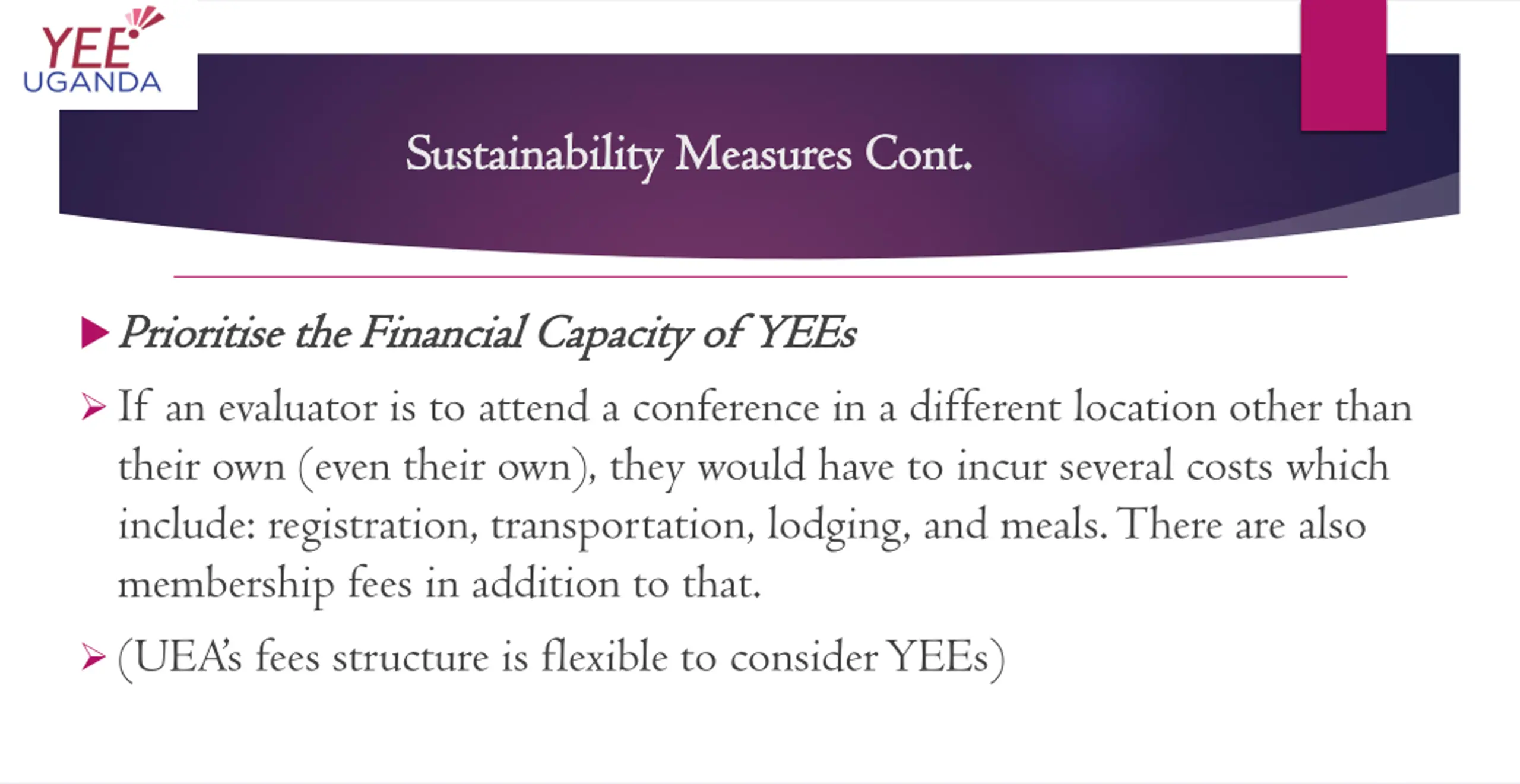 Sustainability Measures Cont. Sustainability Measures Cont. Prioritise the Financial Capacity of YEEs Prioritise the Financial Capacity of YEEs If an evaluator is to attend a conference in a different location other than their own (even their own), they would have to incur several costs which include: registration, transportation, lodging, and meals. There are also membership fees in addition to that. (UEA s fees structure is flexible to consider YEEs)