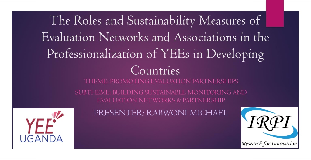 The Roles and Sustainability Measures of Evaluation Networks and Associations in the Professionalization of YEEs in Developing Countries THEME: PROMOTING EVALUATION PARTNERSHIPS SUBTHEME: BUILDING SUSTAINABLE MONITORING AND EVALUATION NETWORKS & PARTNERSHIP PRESENTER: RABWONI MICHAEL