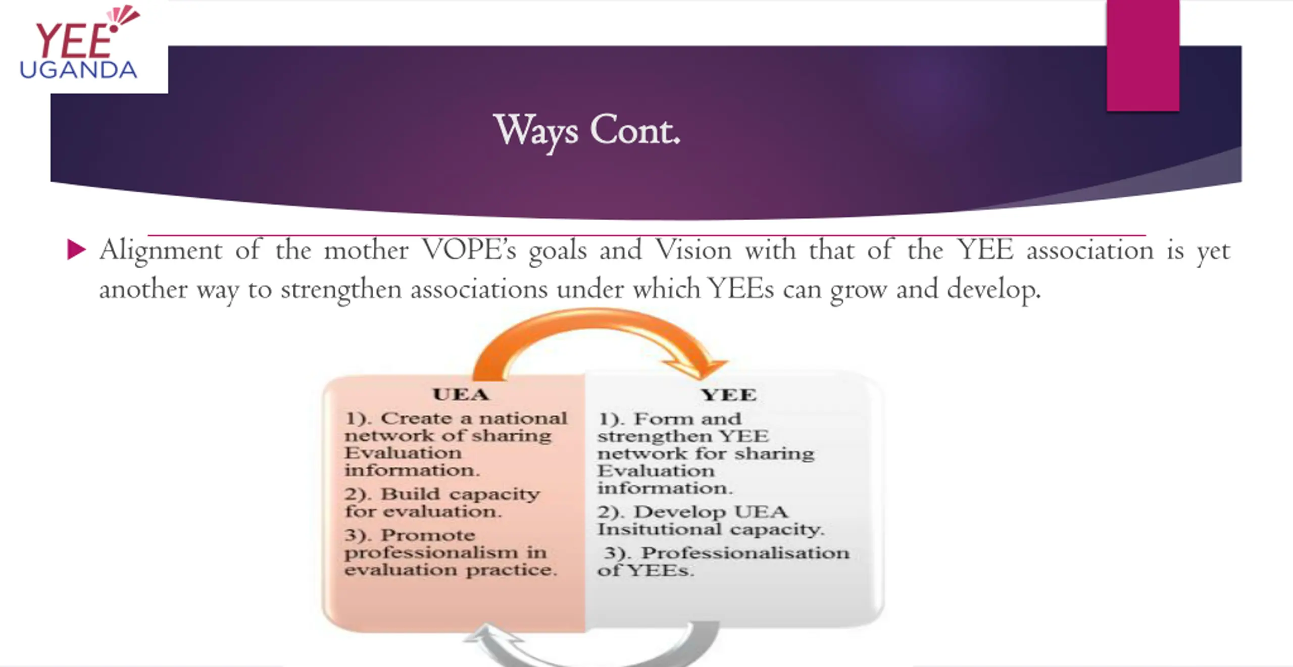 Ways Cont. Ways Cont. Alignment of the mother VOPE s goals and Vision with that of the YEE association is yet another way to strengthen associations under whichYEEs can grow and develop.