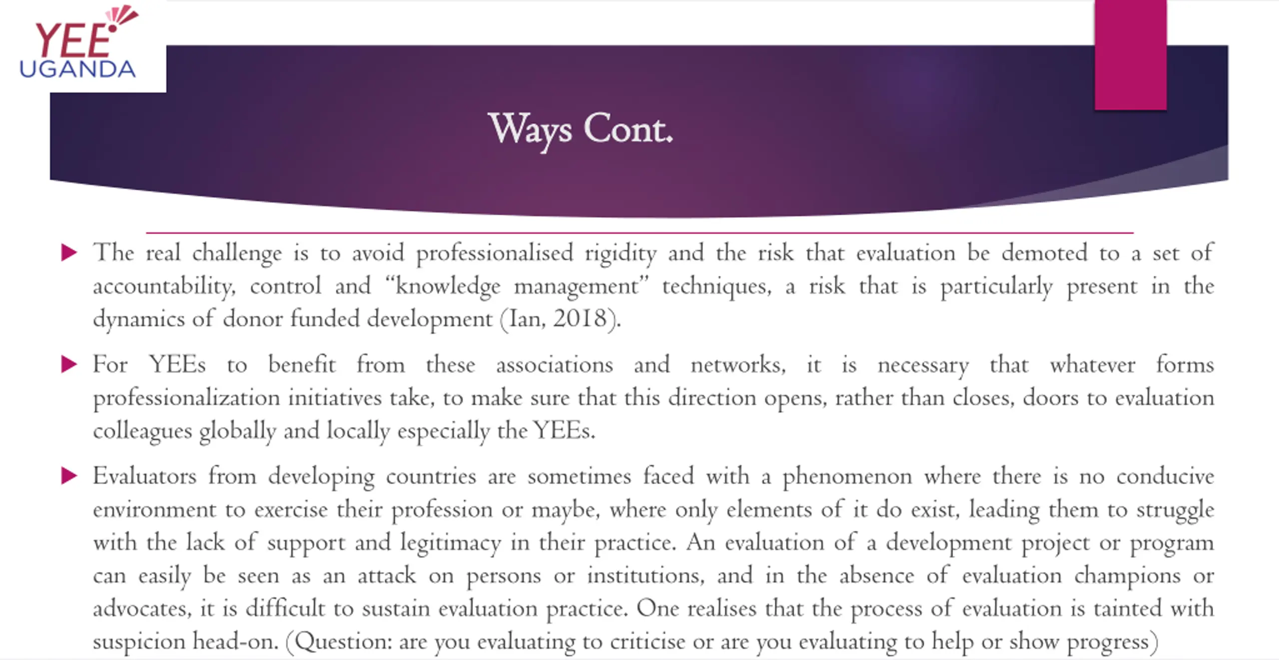 Ways Cont. Ways Cont. The real challenge is to avoid professionalised rigidity and the risk that evaluation be demoted to a set of accountability, control and knowledge management techniques, a risk that is particularly present in the dynamics of donor funded development (Ian, 2018). For YEEs to benefit from these associations and networks, it is necessary that whatever forms professionalization initiatives take, to make sure that this direction opens, rather than closes, doors to evaluation colleagues globally and locally especially theYEEs. Evaluators from developing countries are sometimes faced with a phenomenon where there is no conducive environment to exercise their profession or maybe, where only elements of it do exist, leading them to struggle with the lack of support and legitimacy in their practice. An evaluation of a development project or program can easily be seen as an attack on persons or institutions, and in the absence of evaluation champions or advocates, it is difficult to sustain evaluation practice. One realises that the process of evaluation is tainted with suspicion head-on. (Question: are you evaluating to criticise or are you evaluating to help or show progress)