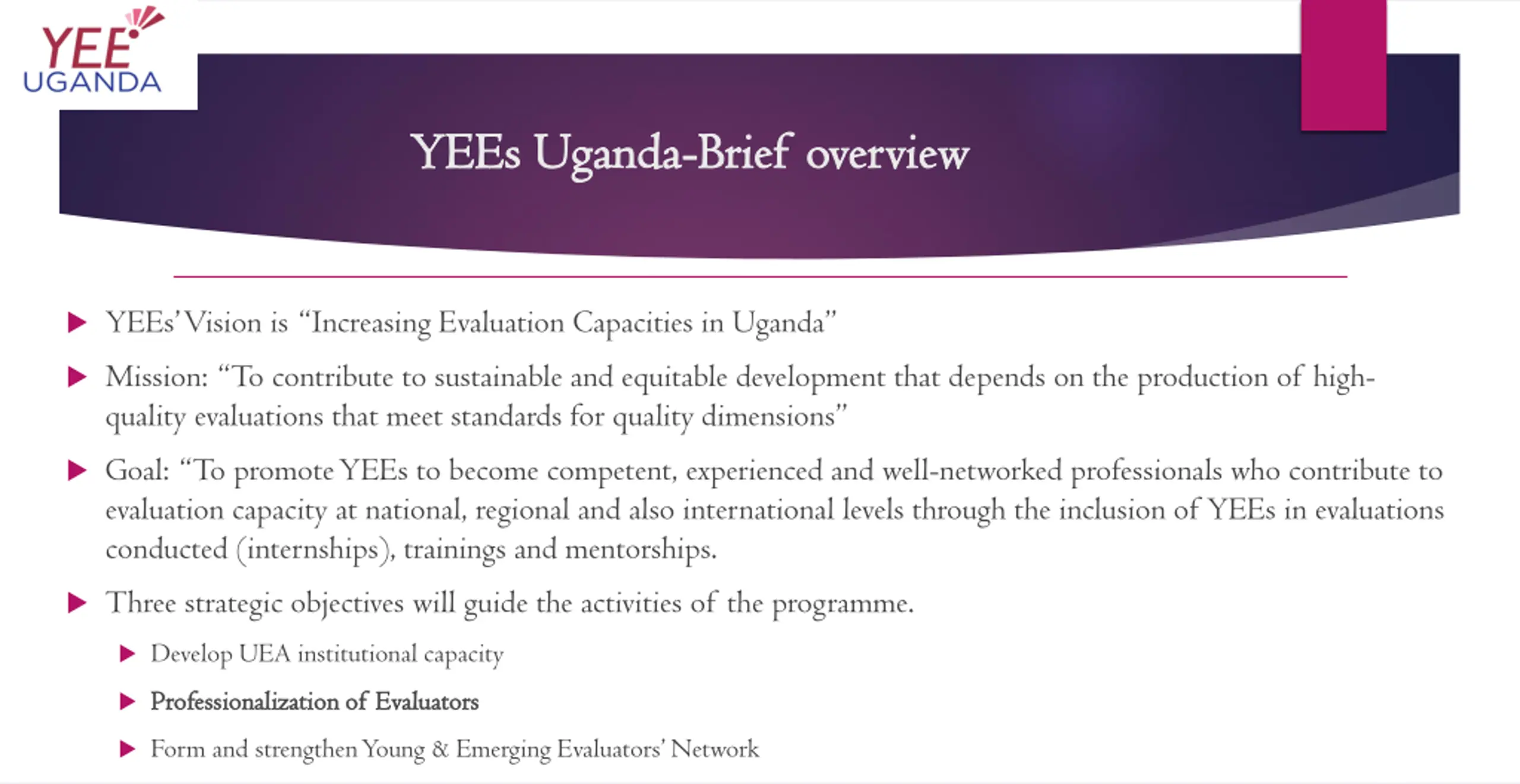 YEEs Uganda YEEs Uganda- -Brief overview Brief overview YEEs Vision is Increasing Evaluation Capacities in Uganda Mission: To contribute to sustainable and equitable development that depends on the production of high- quality evaluations that meet standards for quality dimensions Goal: To promote YEEs to become competent, experienced and well-networked professionals who contribute to evaluation capacity at national, regional and also international levels through the inclusion of YEEs in evaluations conducted (internships), trainings and mentorships. Three strategic objectives will guide the activities of the programme. Develop UEA institutional capacity Professionalization of Evaluators Professionalization of Evaluators Form and strengthen Young & Emerging Evaluators Network