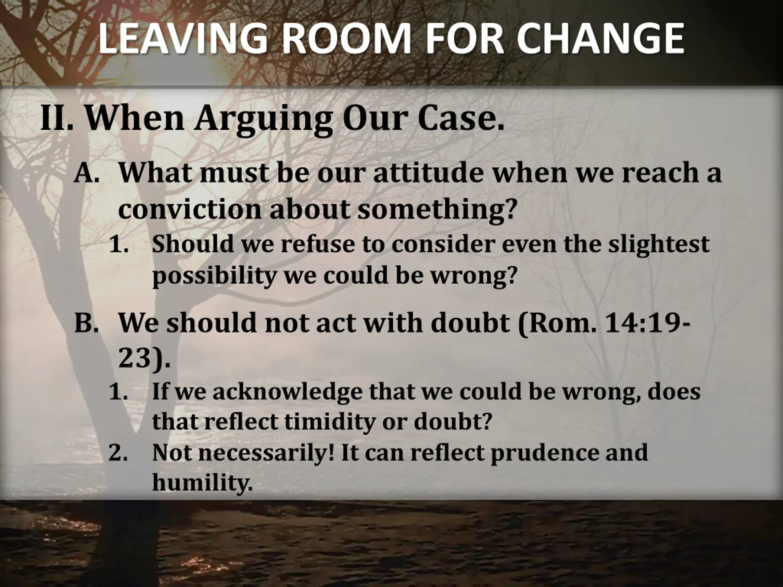 LEAVING ROOM FOR CHANGE II. When Arguing Our Case. A. What must be our attitude when we reach a conviction about something? 1. Should we refuse to consider even the slightest possibility we could be wrong? B. We should not act with doubt (Rom. 14:19- 23). 1. If we acknowledge that we could be wrong, does that reflect timidity or doubt? 2. Not necessarily! It can reflect prudence and humility.