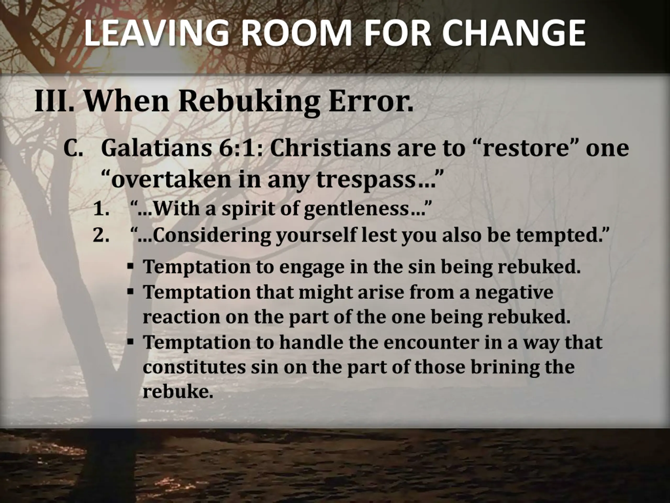 LEAVING ROOM FOR CHANGE III. When Rebuking Error. C. Galatians 6:1: Christians are to restore one overtaken in any trespass 1. With a spirit of gentleness 2. Considering yourself lest you also be tempted. Temptation to engage in the sin being rebuked. Temptation that might arise from a negative reaction on the part of the one being rebuked. Temptation to handle the encounter in a way that constitutes sin on the part of those brining the rebuke.