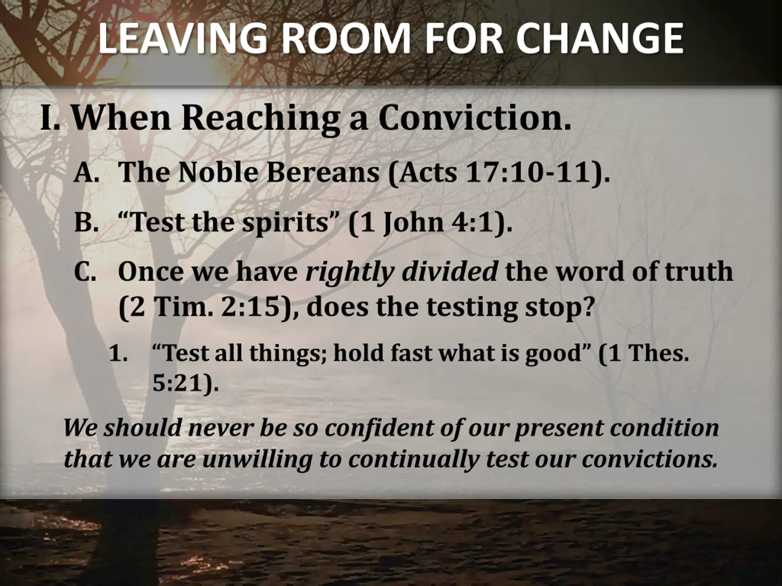 LEAVING ROOM FOR CHANGE I. When Reaching a Conviction. A. The Noble Bereans (Acts 17:10-11). B. Test the spirits (1 John 4:1). C. Once we have rightly divided the word of truth (2 Tim. 2:15), does the testing stop? 1. Test all things; hold fast what is good (1 Thes. 5:21). We should never be so confident of our present condition that we are unwilling to continually test our convictions.