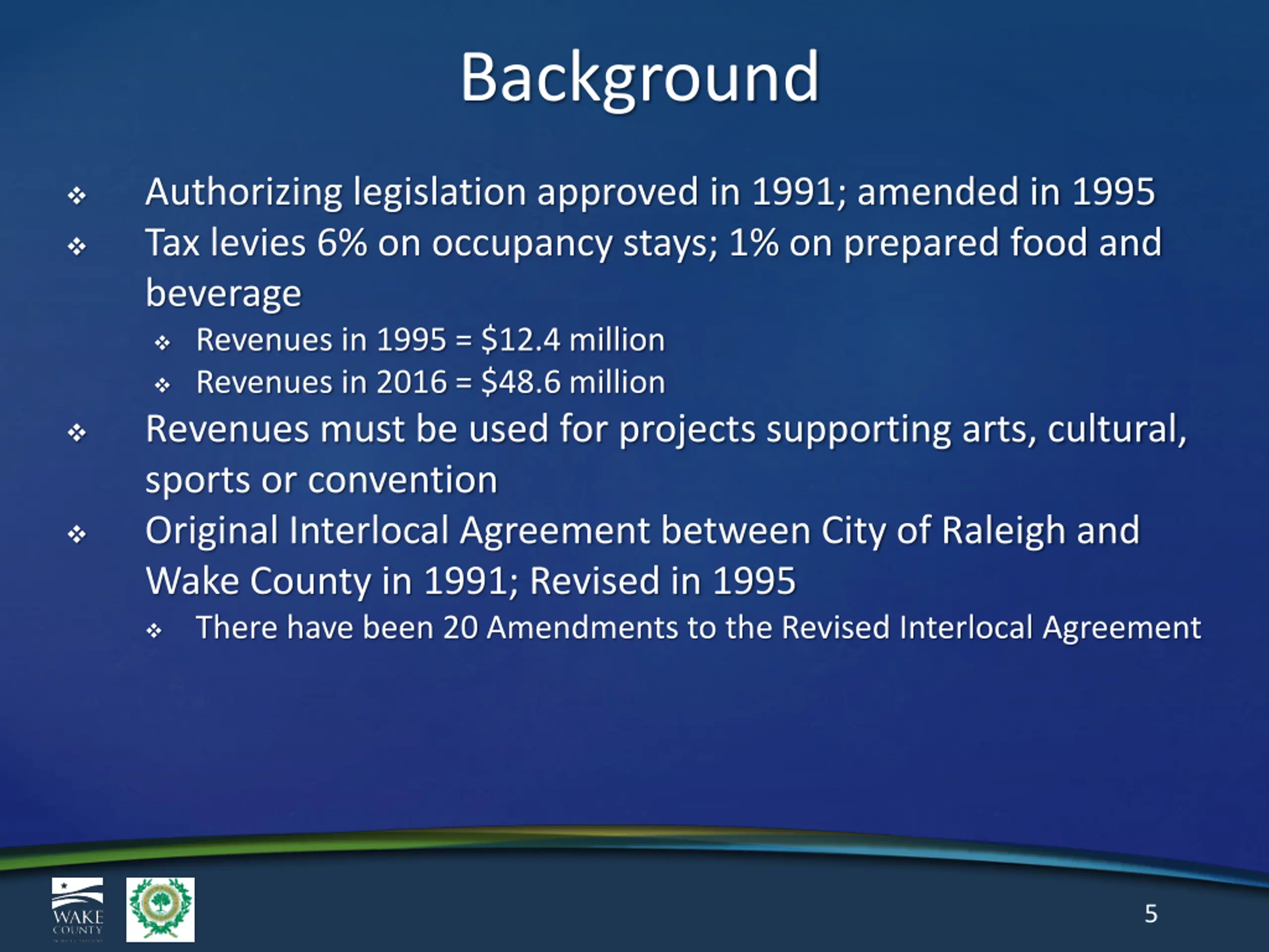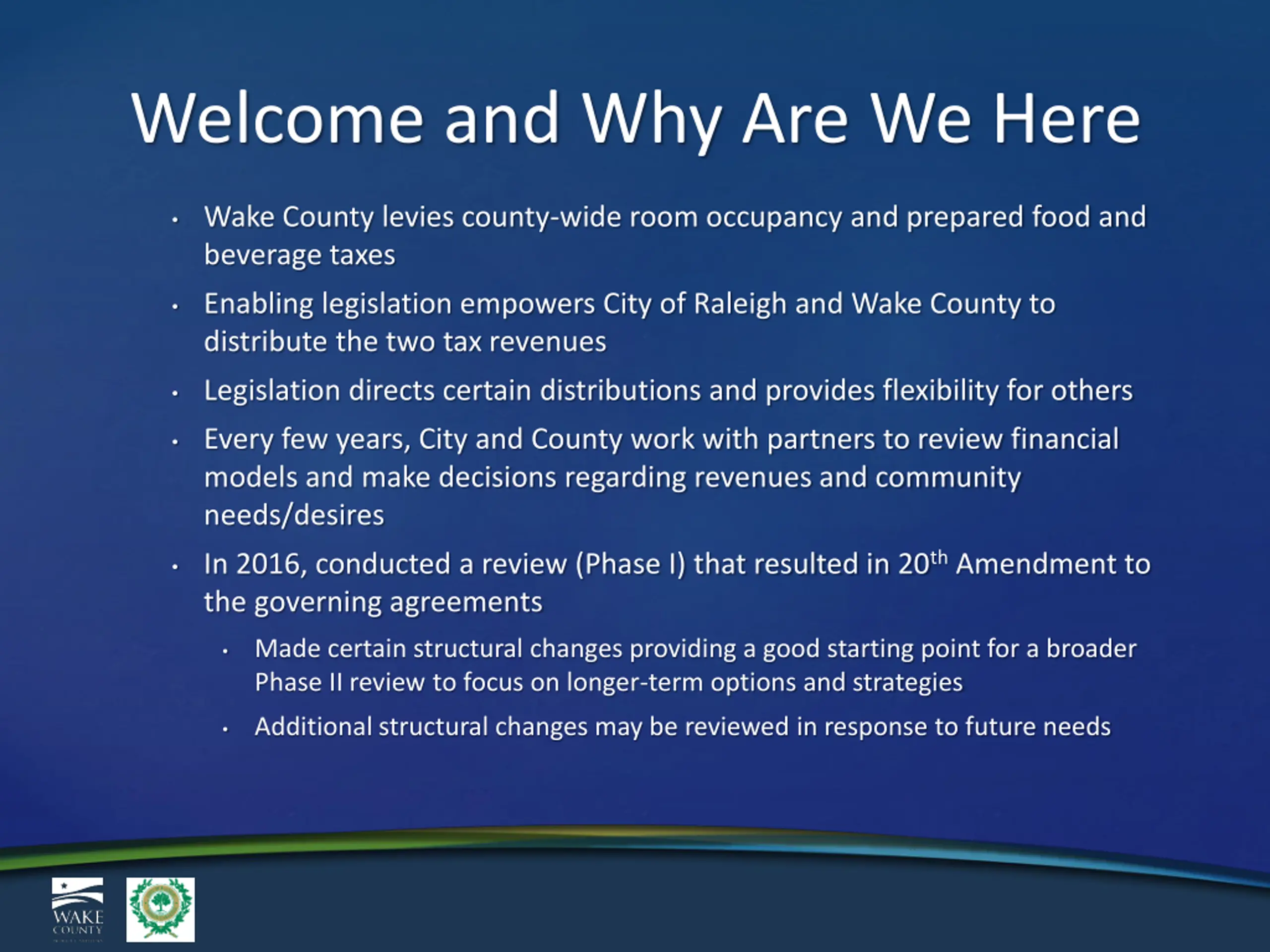 Welcome and Why Are We Here Wake County levies county-wide room occupancy and prepared food and beverage taxes Enabling legislation empowers City of Raleigh and Wake County to distribute the two tax revenues Legislation directs certain distributions and provides flexibility for others Every few years, City and County work with partners to review financial models and make decisions regarding revenues and community needs/desires In 2016, conducted a review (Phase I) that resulted in 20th Amendment to the governing agreements Made certain structural changes providing a good starting point for a broader Phase II review to focus on longer-term options and strategies Additional structural changes may be reviewed in response to future needs