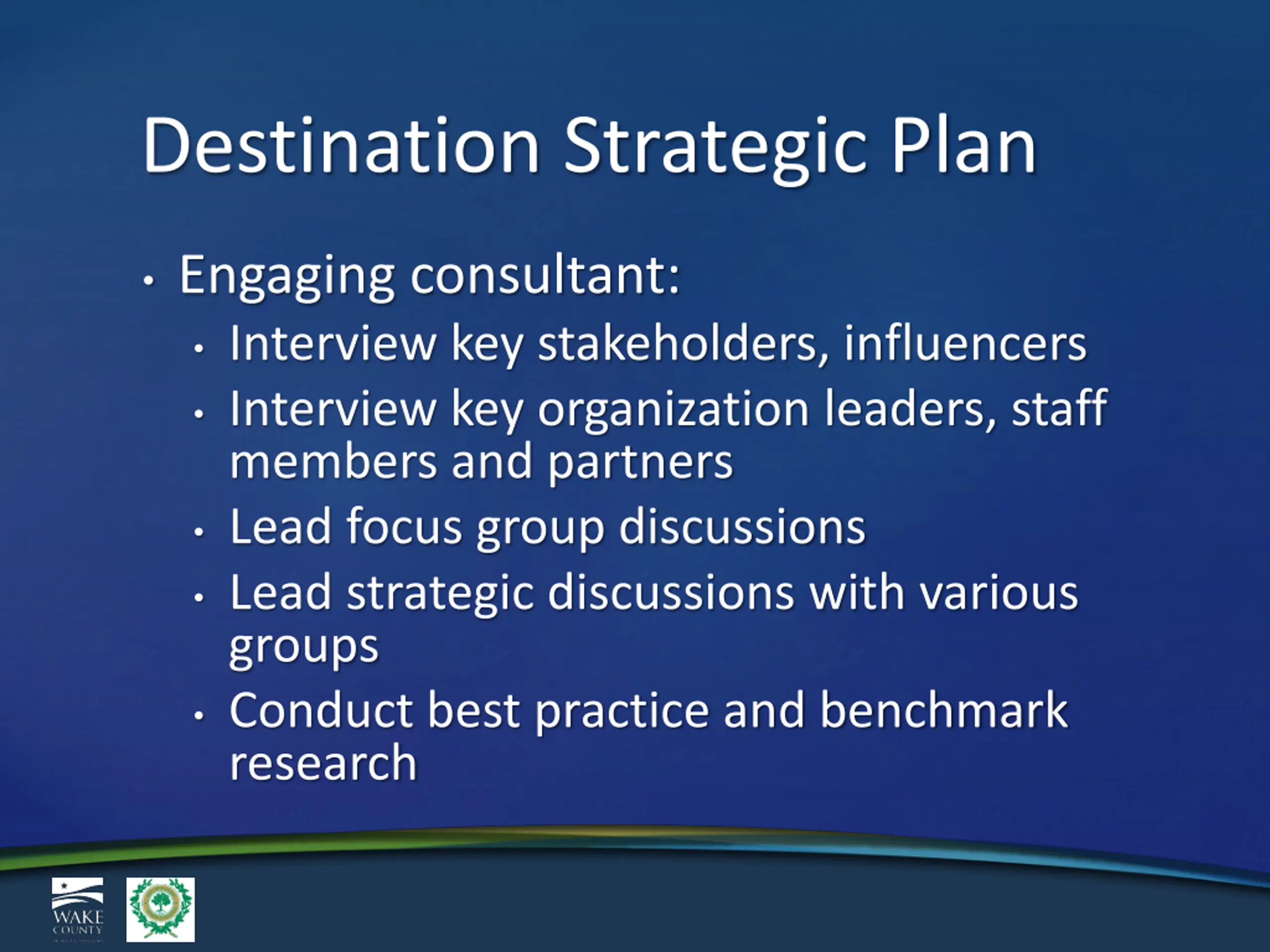 Destination Strategic Plan Engaging consultant: Interview key stakeholders, influencers Interview key organization leaders, staff members and partners Lead focus group discussions Lead strategic discussions with various groups Conduct best practice and benchmark research