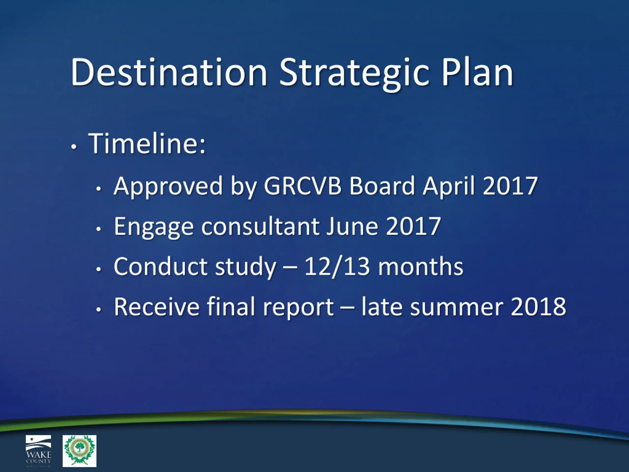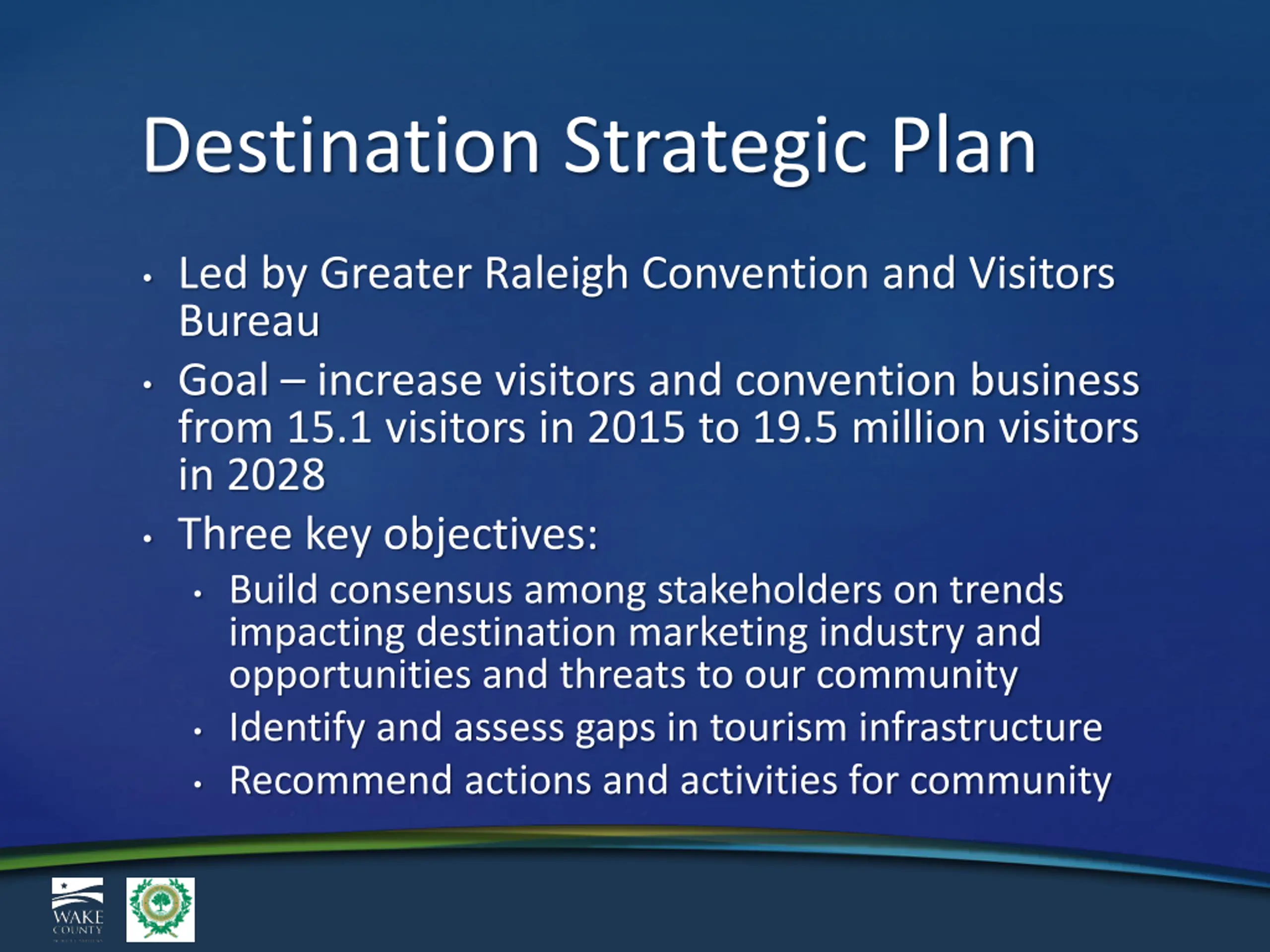Destination Strategic Plan Led by Greater Raleigh Convention and Visitors Bureau Goal increase visitors and convention business from 15.1 visitors in 2015 to 19.5 million visitors in 2028 Three key objectives: Build consensus among stakeholders on trends impacting destination marketing industry and opportunities and threats to our community Identify and assess gaps in tourism infrastructure Recommend actions and activities for community