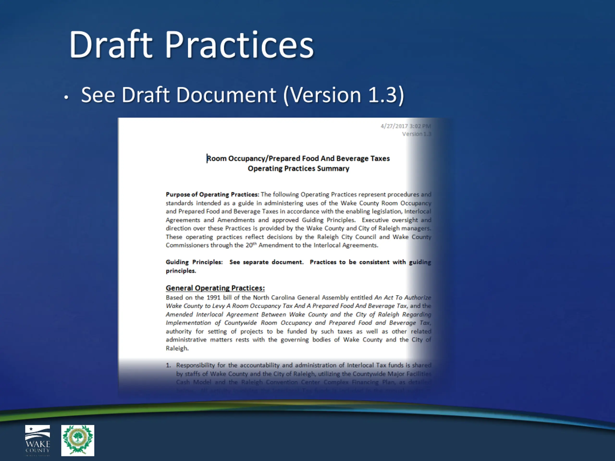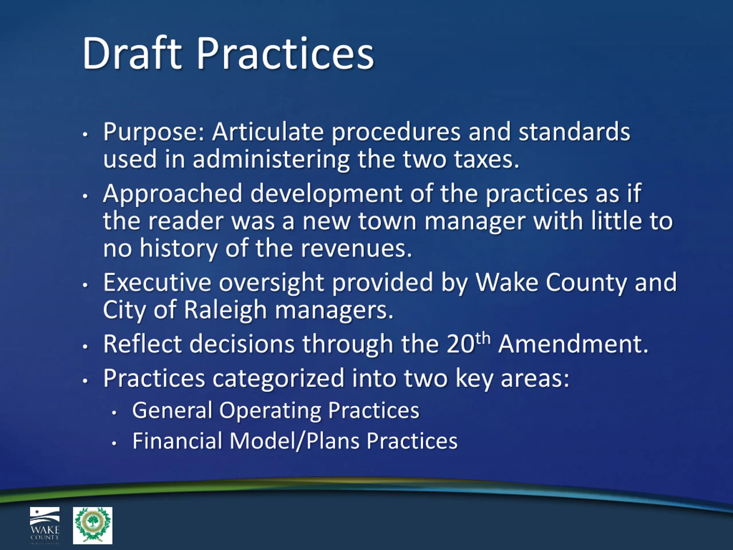 Draft Practices Purpose: Articulate procedures and standards used in administering the two taxes. Approached development of the practices as if the reader was a new town manager with little to no history of the revenues. Executive oversight provided by Wake County and City of Raleigh managers. Reflect decisions through the 20th Amendment. Practices categorized into two key areas: General Operating Practices Financial Model/Plans Practices