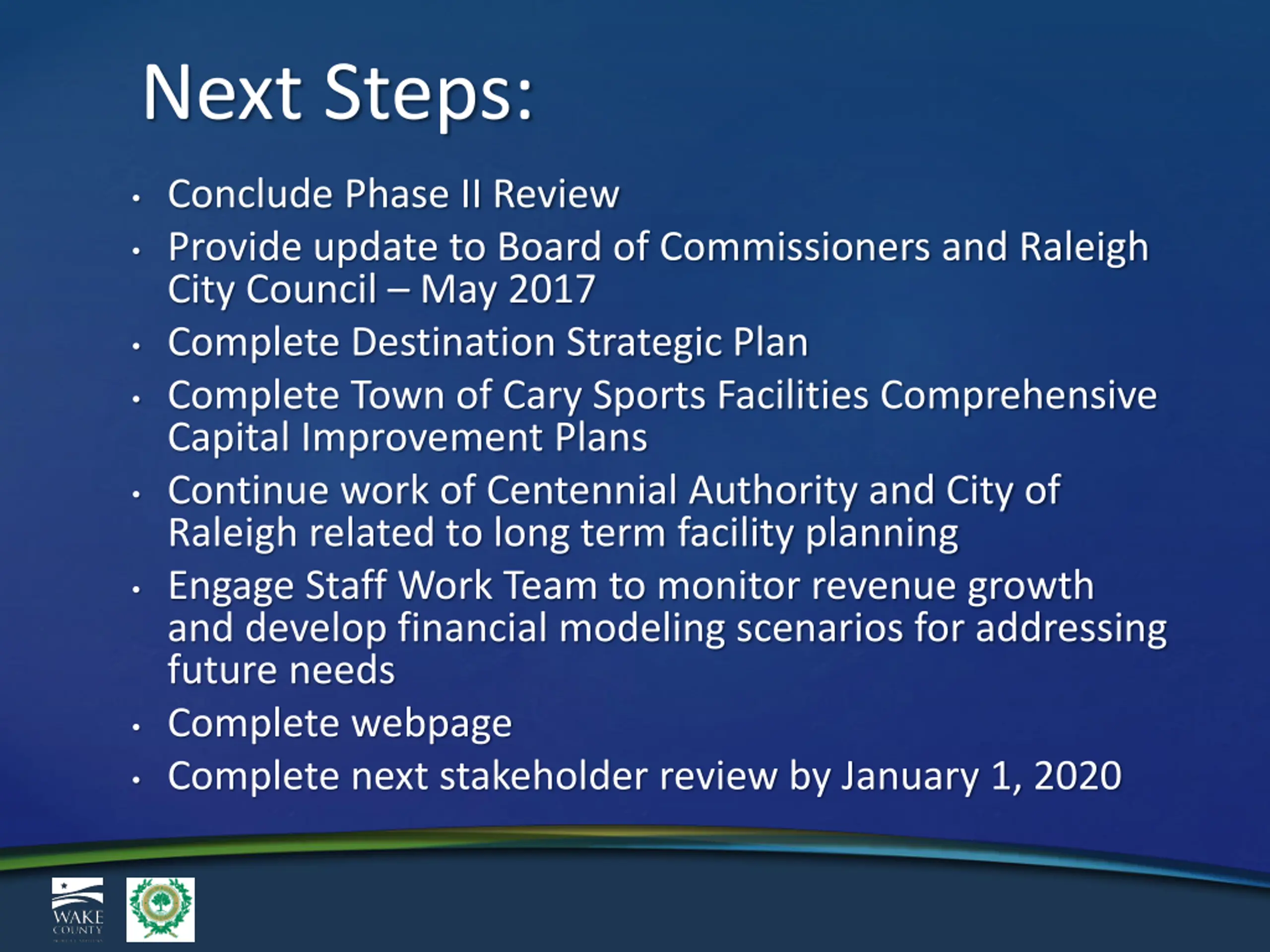 Next Steps: Conclude Phase II Review Provide update to Board of Commissioners and Raleigh City Council May 2017 Complete Destination Strategic Plan Complete Town of Cary Sports Facilities Comprehensive Capital Improvement Plans Continue work of Centennial Authority and City of Raleigh related to long term facility planning Engage Staff Work Team to monitor revenue growth and develop financial modeling scenarios for addressing future needs Complete webpage Complete next stakeholder review by January 1, 2020
