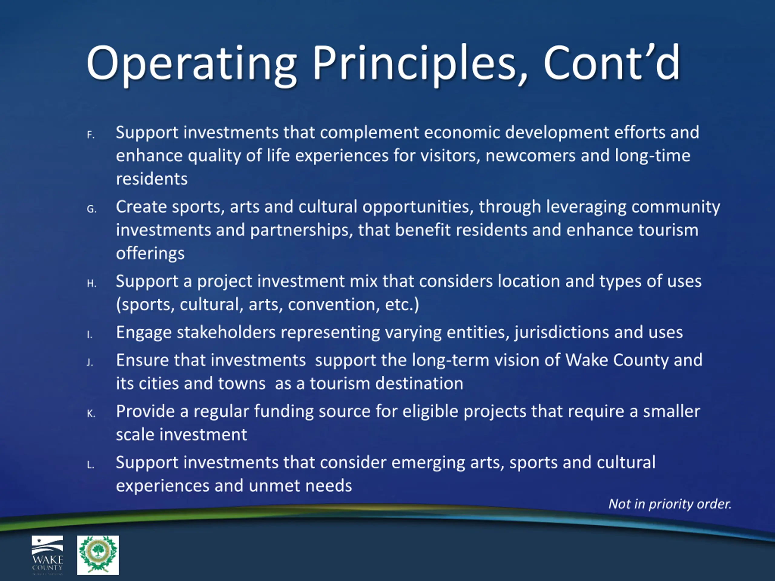 Operating Principles, Contd Support investments that complement economic development efforts and enhance quality of life experiences for visitors, newcomers and long-time residents Create sports, arts and cultural opportunities, through leveraging community investments and partnerships, that benefit residents and enhance tourism offerings Support a project investment mix that considers location and types of uses (sports, cultural, arts, convention, etc.) Engage stakeholders representing varying entities, jurisdictions and uses Ensure that investments support the long-term vision of Wake County and its cities and towns as a tourism destination Provide a regular funding source for eligible projects that require a smaller scale investment Support investments that consider emerging arts, sports and cultural experiences and unmet needs F. G. H. I. J. K. L. Not in priority order.