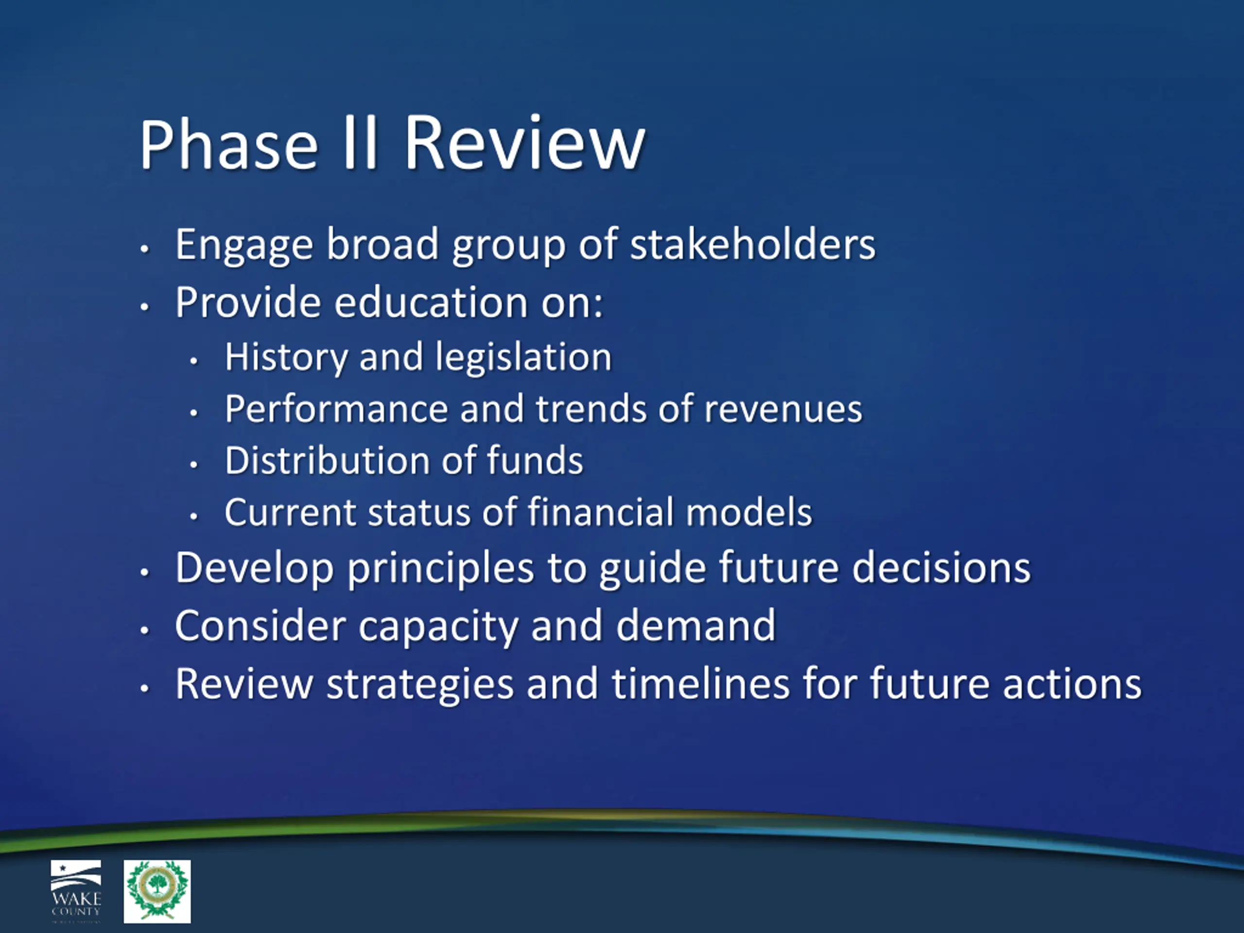 Phase II Review Engage broad group of stakeholders Provide education on: History and legislation Performance and trends of revenues Distribution of funds Current status of financial models Develop principles to guide future decisions Consider capacity and demand Review strategies and timelines for future actions