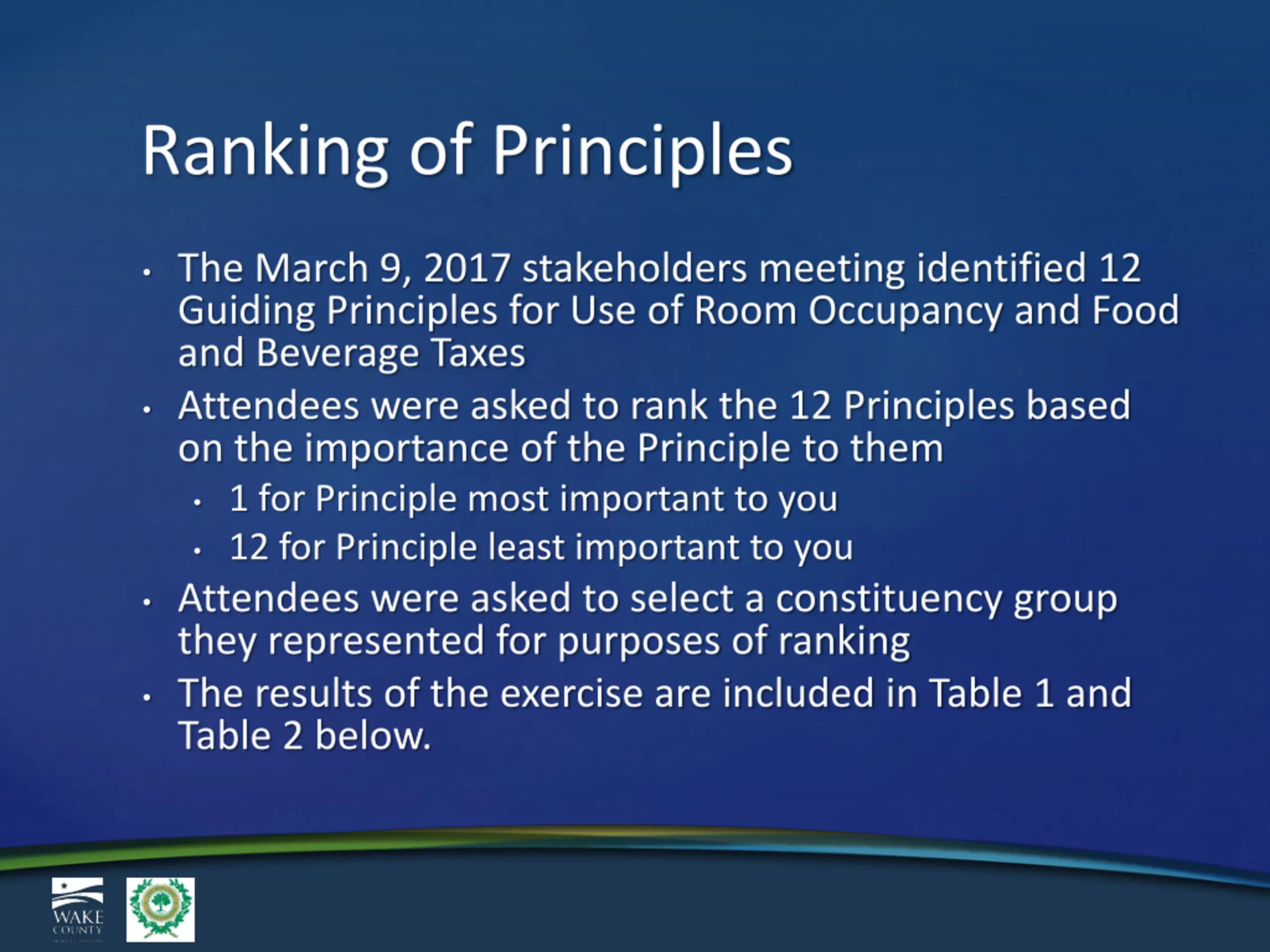 Ranking of Principles The March 9, 2017 stakeholders meeting identified 12 Guiding Principles for Use of Room Occupancy and Food and Beverage Taxes Attendees were asked to rank the 12 Principles based on the importance of the Principle to them 1 for Principle most important to you 12 for Principle least important to you Attendees were asked to select a constituency group they represented for purposes of ranking The results of the exercise are included in Table 1 and Table 2 below.