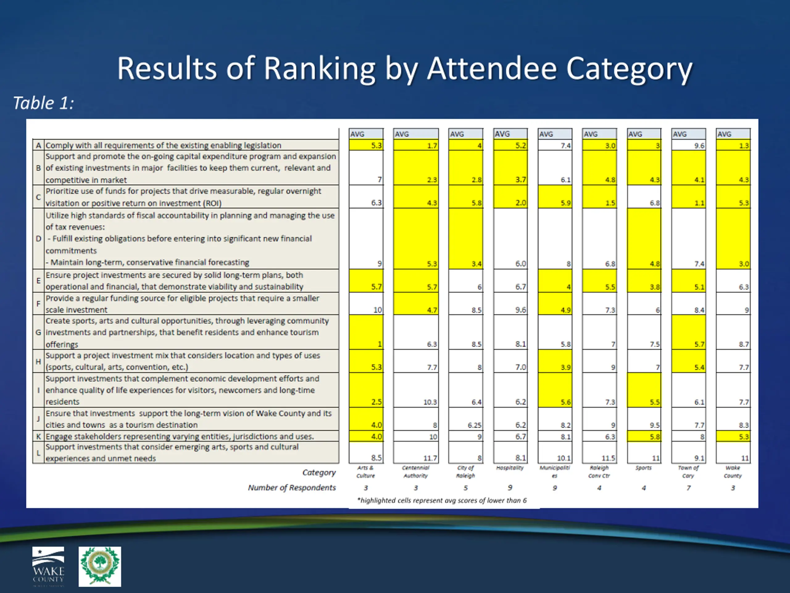 Results of Ranking by Attendee Category Table 1: *highlighted cells represent avg scores of lower than 6