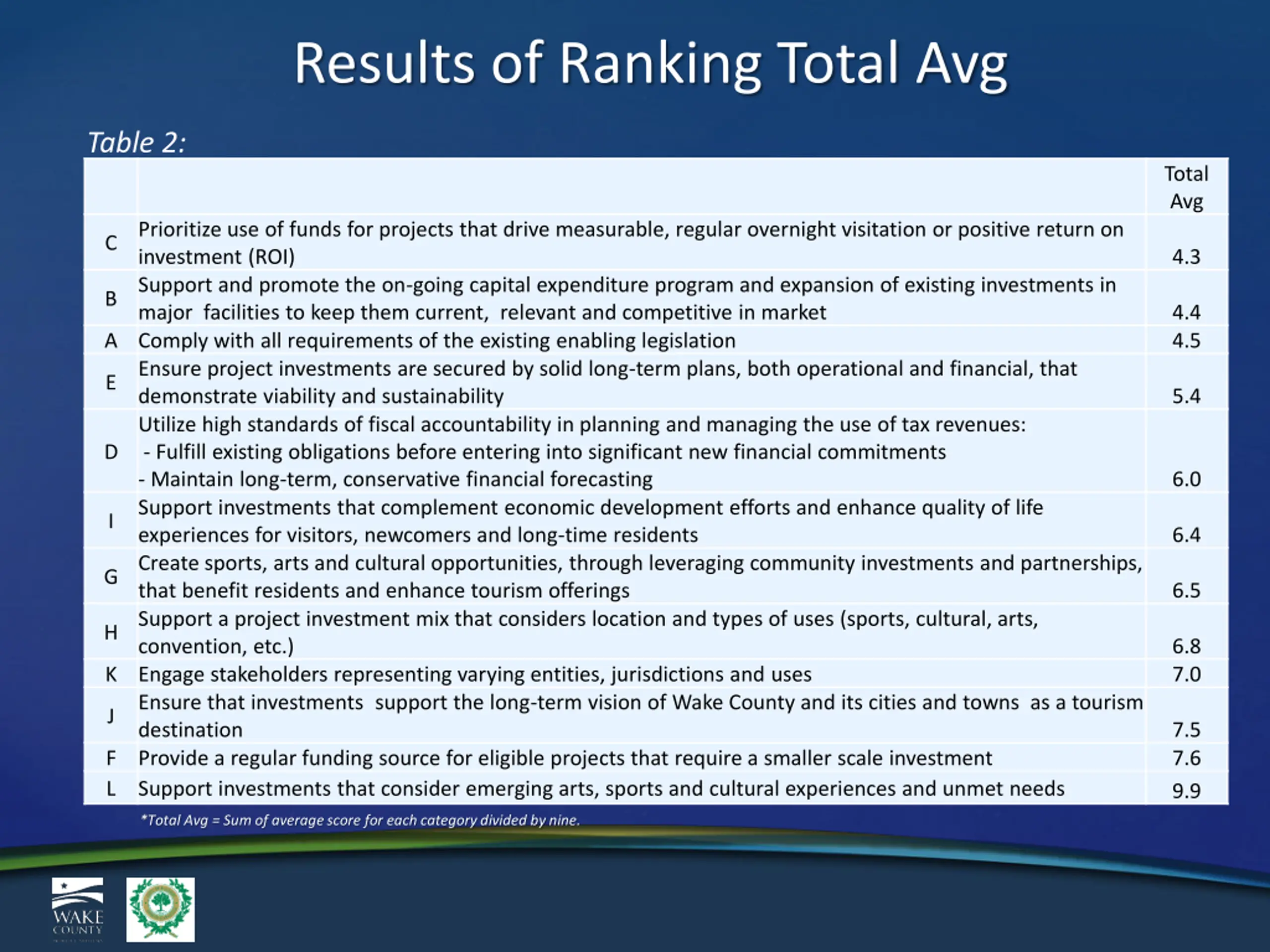 Results of Ranking Total Avg Table 2: Total Avg Prioritize use of funds for projects that drive measurable, regular overnight visitation or positive return on investment (ROI) Support and promote the on-going capital expenditure program and expansion of existing investments in major facilities to keep them current, relevant and competitive in market A Comply with all requirements of the existing enabling legislation Ensure project investments are secured by solid long-term plans, both operational and financial, that demonstrate viability and sustainability Utilize high standards of fiscal accountability in planning and managing the use of tax revenues: - Fulfill existing obligations before entering into significant new financial commitments - Maintain long-term, conservative financial forecasting Support investments that complement economic development efforts and enhance quality of life experiences for visitors, newcomers and long-time residents Create sports, arts and cultural opportunities, through leveraging community investments and partnerships, that benefit residents and enhance tourism offerings Support a project investment mix that considers location and types of uses (sports, cultural, arts, convention, etc.) K Engage stakeholders representing varying entities, jurisdictions and uses Ensure that investments support the long-term vision of Wake County and its cities and towns as a tourism destination F Provide a regular funding source for eligible projects that require a smaller scale investment L Support investments that consider emerging arts, sports and cultural experiences and unmet needs C 4.3 B 4.4 4.5 E 5.4 D 6.0 I 6.4 G 6.5 H 6.8 7.0 J 7.5 7.6 9.9 *Total Avg = Sum of average score for each category divided by nine.