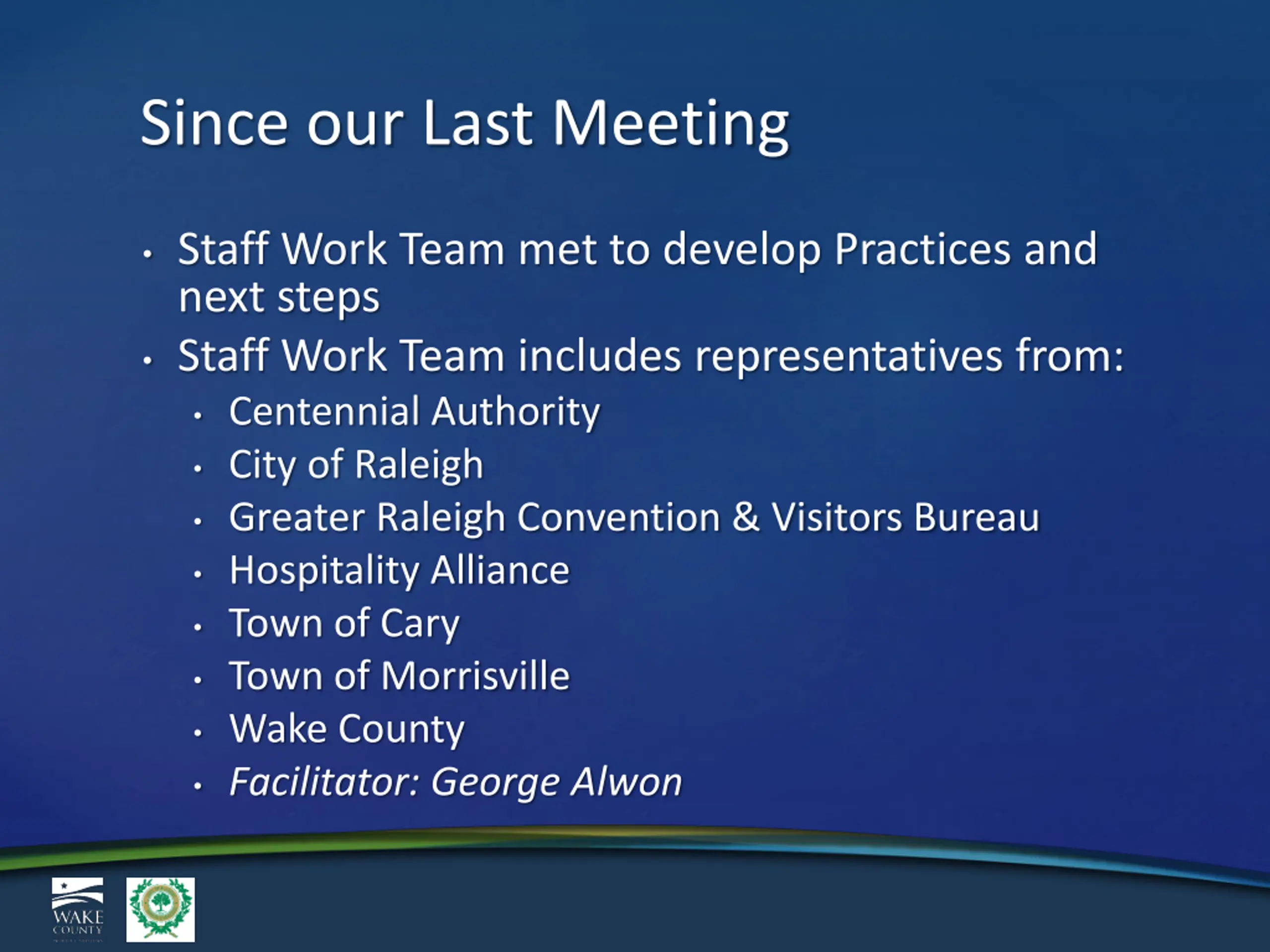 Since our Last Meeting Staff Work Team met to develop Practices and next steps Staff Work Team includes representatives from: Centennial Authority City of Raleigh Greater Raleigh Convention & Visitors Bureau Hospitality Alliance Town of Cary Town of Morrisville Wake County Facilitator: George Alwon