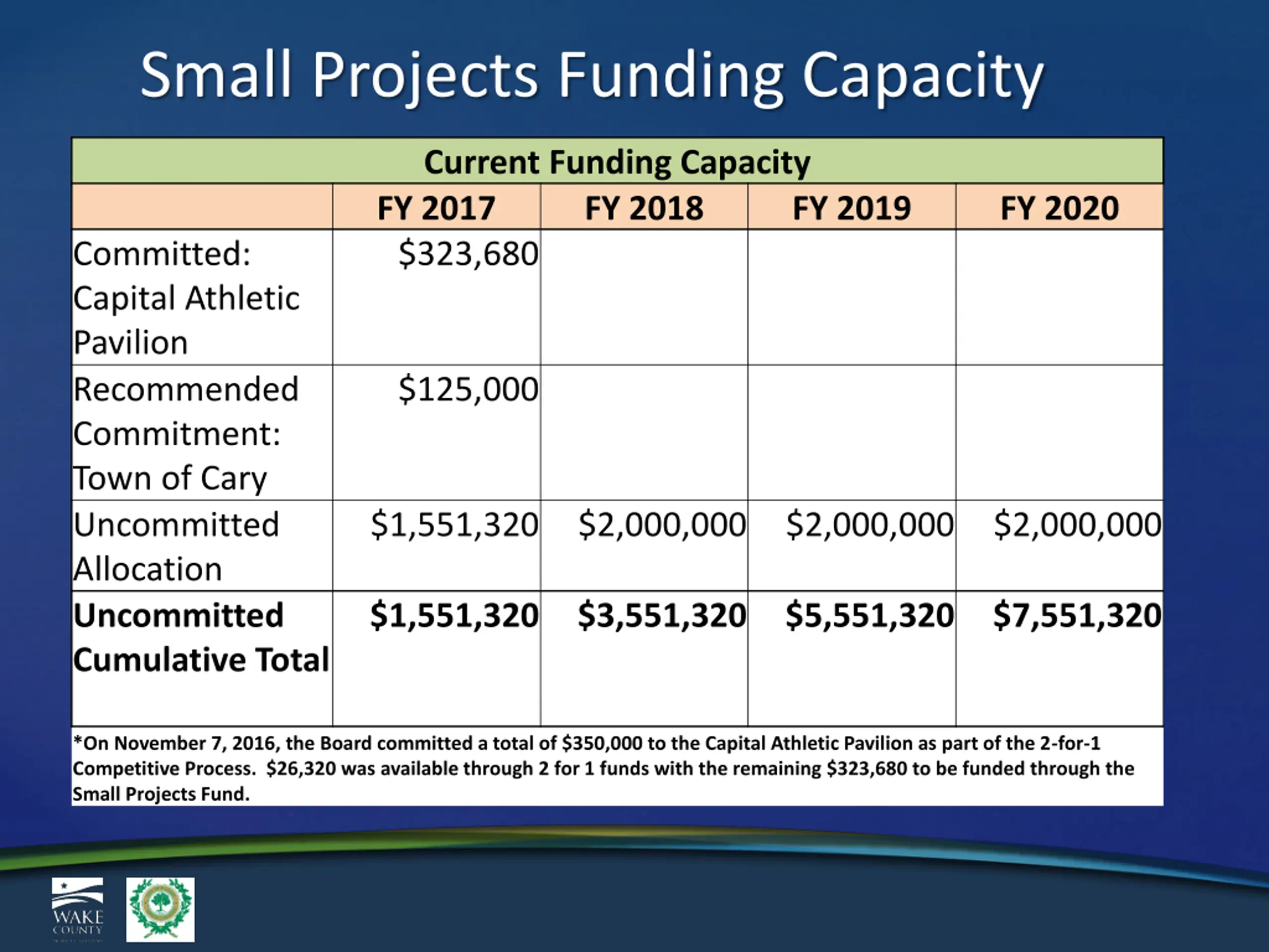 Small Projects Funding Capacity Current Funding Capacity FY 2017 FY 2018 $323,680 FY 2019 FY 2020 Committed: Capital Athletic Pavilion Recommended Commitment: Town of Cary Uncommitted Allocation Uncommitted Cumulative Total $125,000 $1,551,320 $2,000,000 $2,000,000 $2,000,000 $1,551,320 $3,551,320 $5,551,320 $7,551,320 *On November 7, 2016, the Board committed a total of $350,000 to the Capital Athletic Pavilion as part of the 2-for-1 Competitive Process. $26,320 was available through 2 for 1 funds with the remaining $323,680 to be funded through the Small Projects Fund.