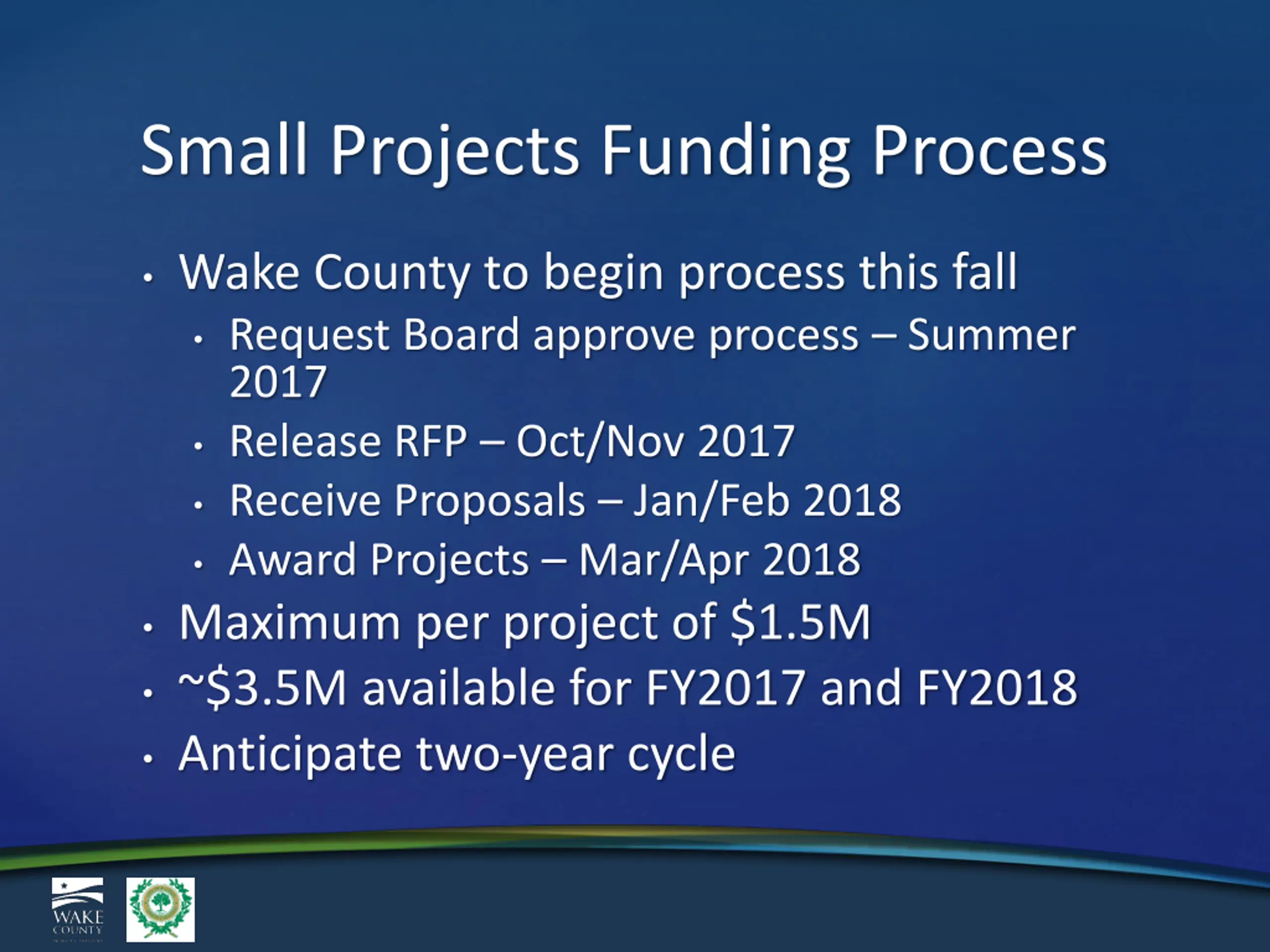 Small Projects Funding Process Wake County to begin process this fall Request Board approve process Summer 2017 Release RFP Oct/Nov 2017 Receive Proposals Jan/Feb 2018 Award Projects Mar/Apr 2018 Maximum per project of $1.5M ~$3.5M available for FY2017 and FY2018 Anticipate two-year cycle