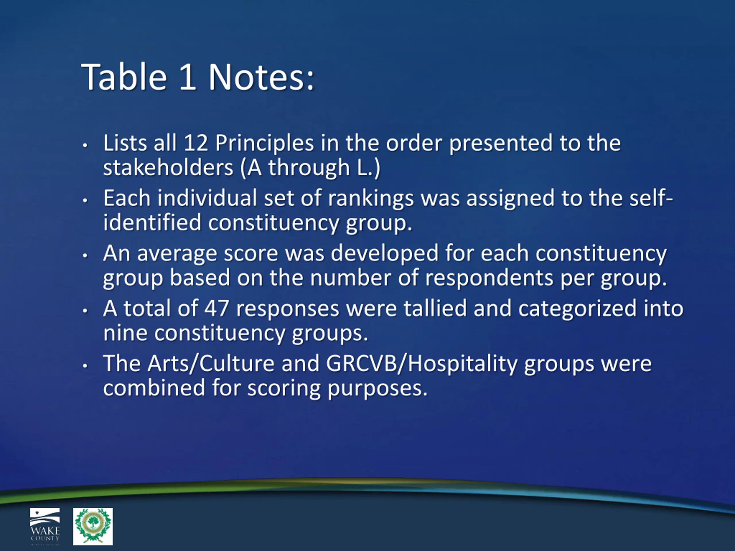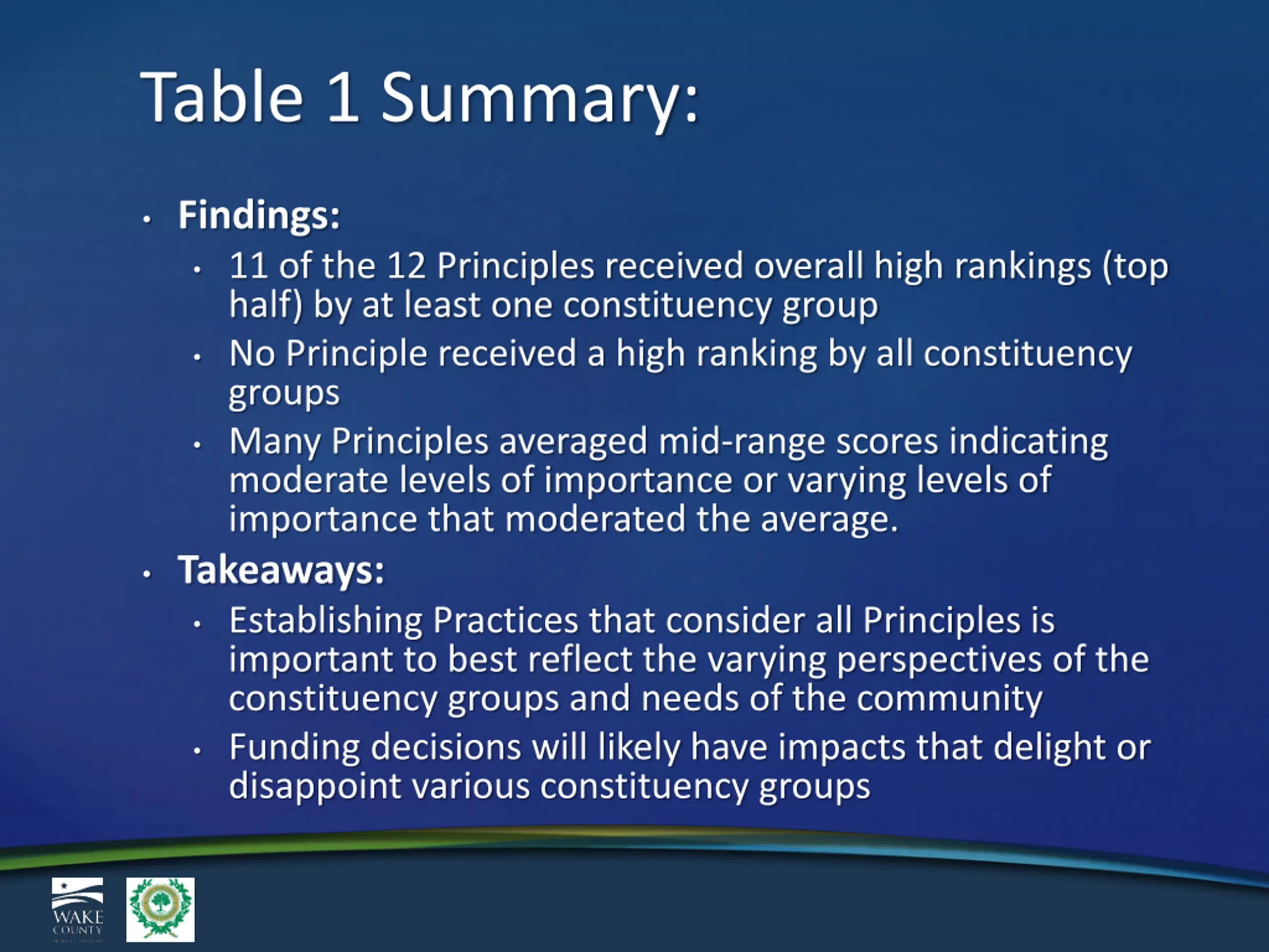 Table 1 Summary: Findings: 11 of the 12 Principles received overall high rankings (top half) by at least one constituency group No Principle received a high ranking by all constituency groups Many Principles averaged mid-range scores indicating moderate levels of importance or varying levels of importance that moderated the average. Takeaways: Establishing Practices that consider all Principles is important to best reflect the varying perspectives of the constituency groups and needs of the community Funding decisions will likely have impacts that delight or disappoint various constituency groups