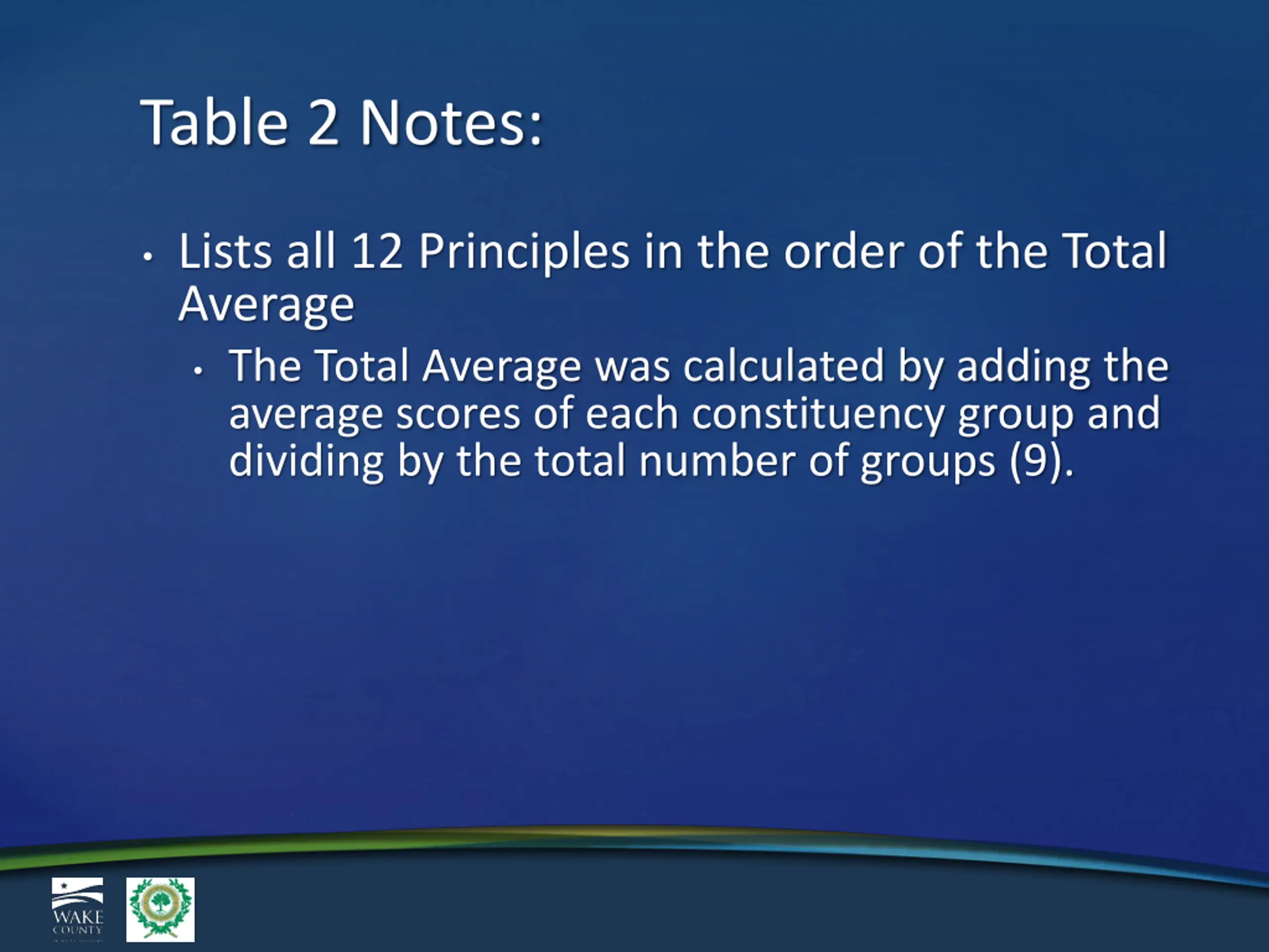 Table 2 Notes: Lists all 12 Principles in the order of the Total Average The Total Average was calculated by adding the average scores of each constituency group and dividing by the total number of groups (9).