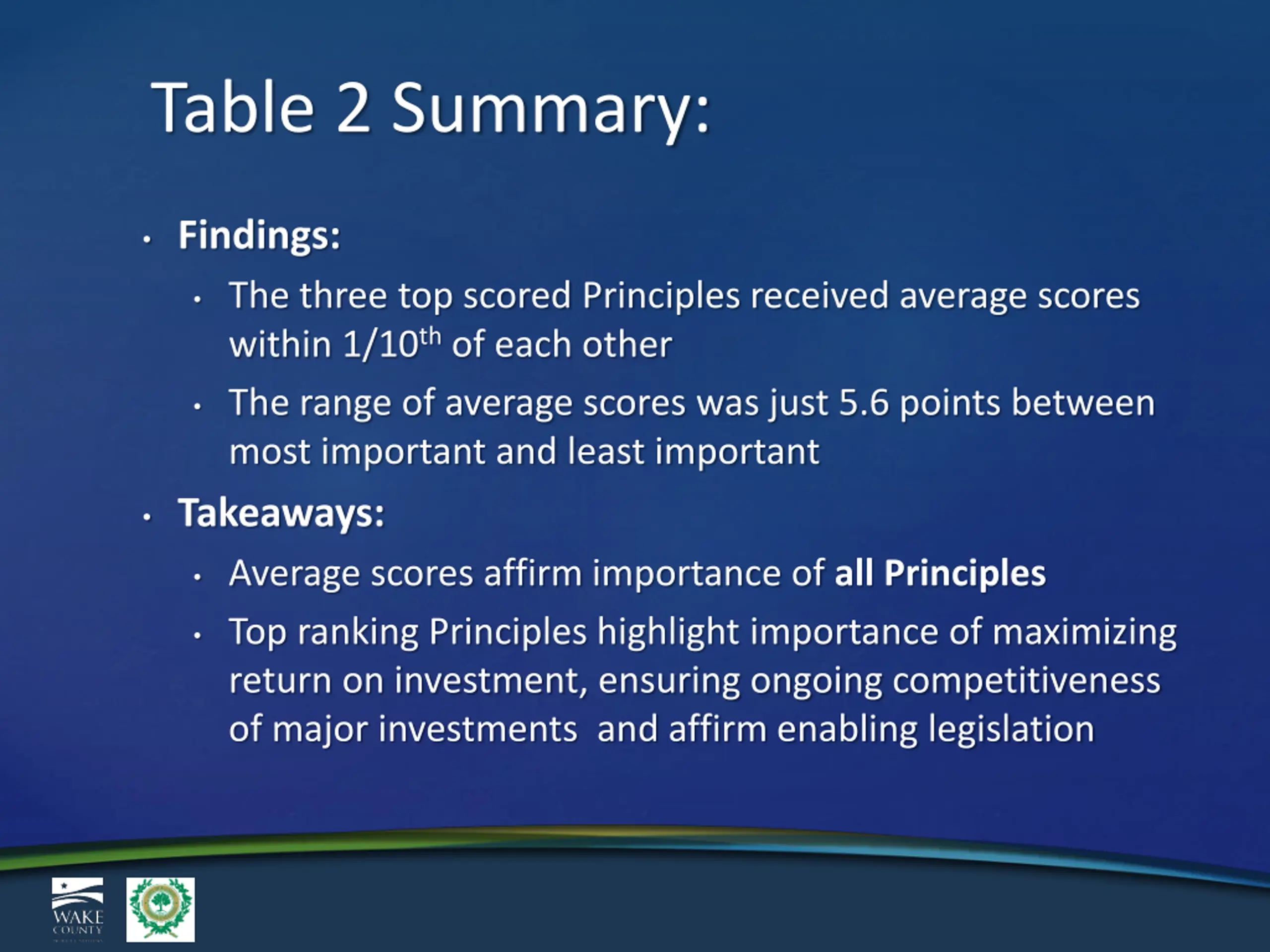 Table 2 Summary: Findings: The three top scored Principles received average scores within 1/10th of each other The range of average scores was just 5.6 points between most important and least important Takeaways: Average scores affirm importance of all Principles Top ranking Principles highlight importance of maximizing return on investment, ensuring ongoing competitiveness of major investments and affirm enabling legislation