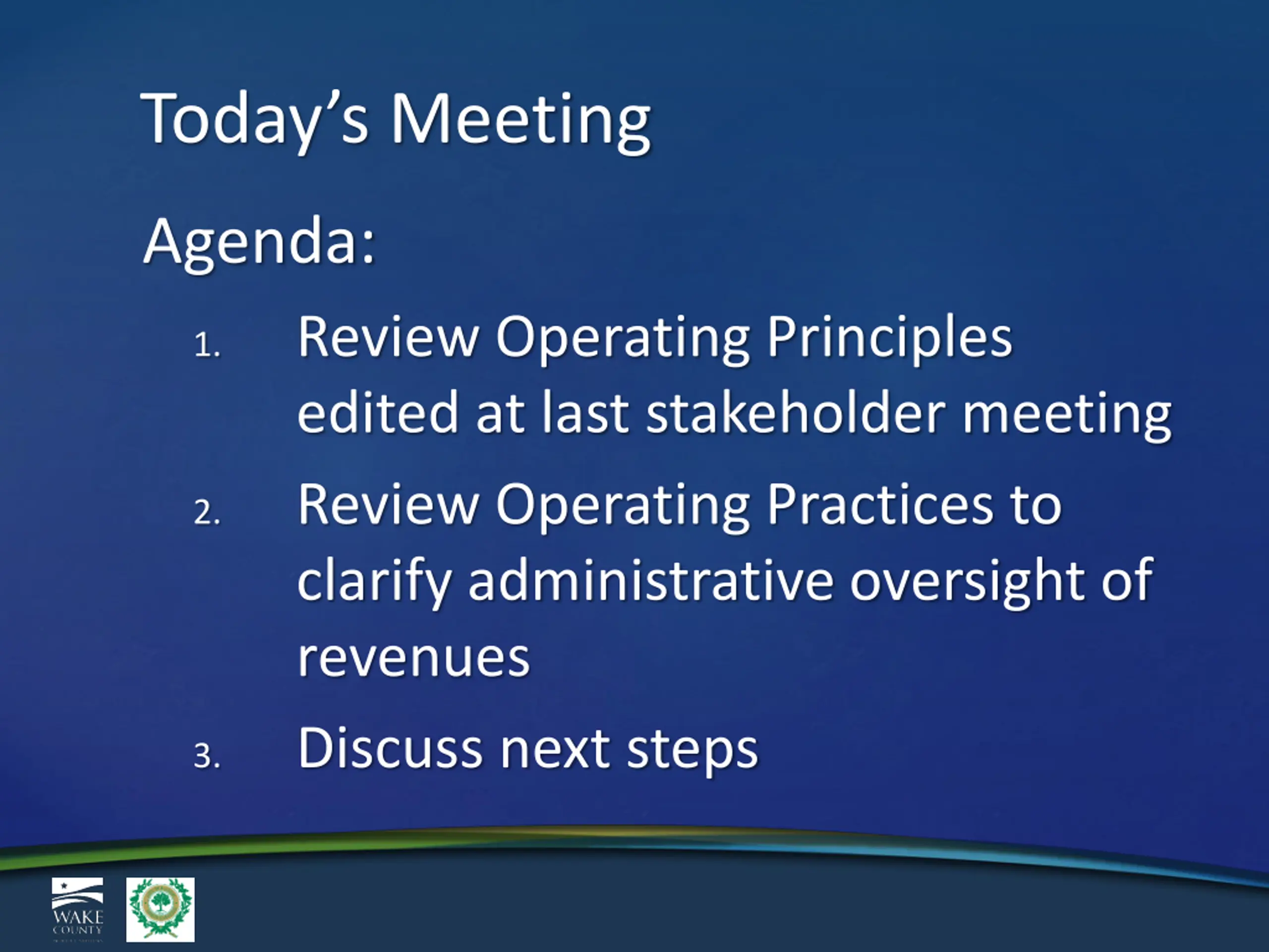 Todays Meeting Agenda: Review Operating Principles edited at last stakeholder meeting Review Operating Practices to clarify administrative oversight of revenues Discuss next steps 1. 2. 3.